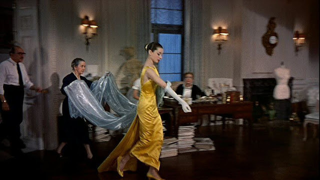 Девушка полностью окунается в мир модной индустрии, примеряя сотни нарядов эпохи золотого Голливуда. На Хепберн появляются длинные платья из тафты с бюстье, в дополнение к которым идет дюжина украшений с бриллиантами и однотонные kitten heels. По ходу фильма простота Джоанн выходит наружу, что выражается в неприметных свитерах и узких брюках черного цвета или платьях-футлярах блеклых цветов.