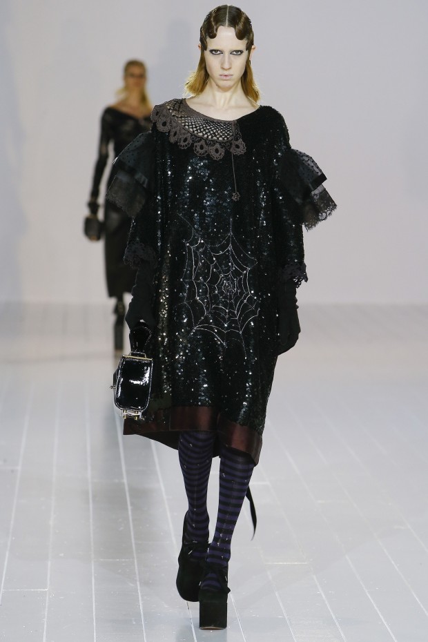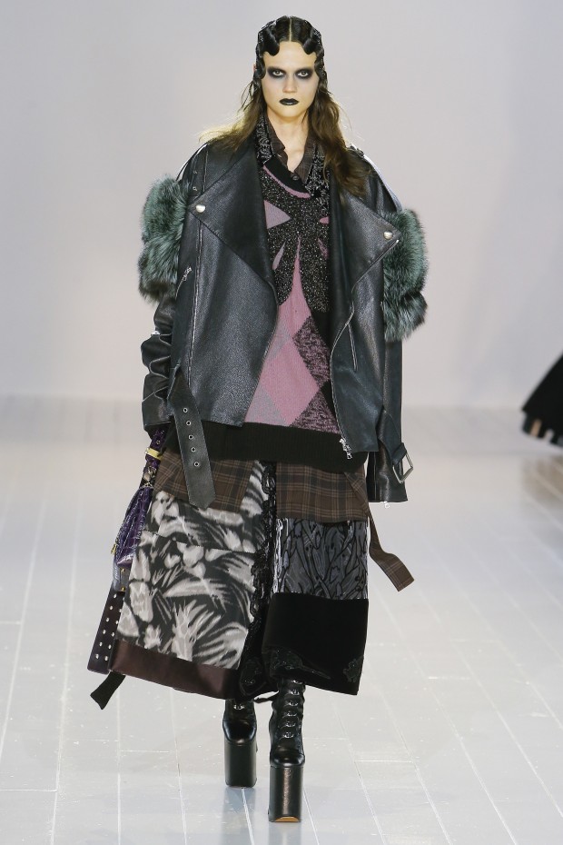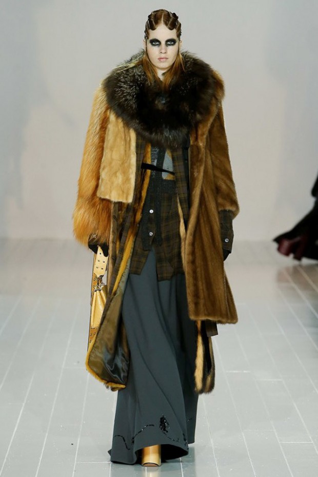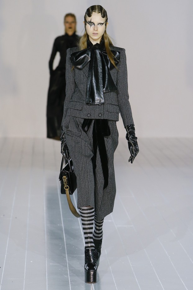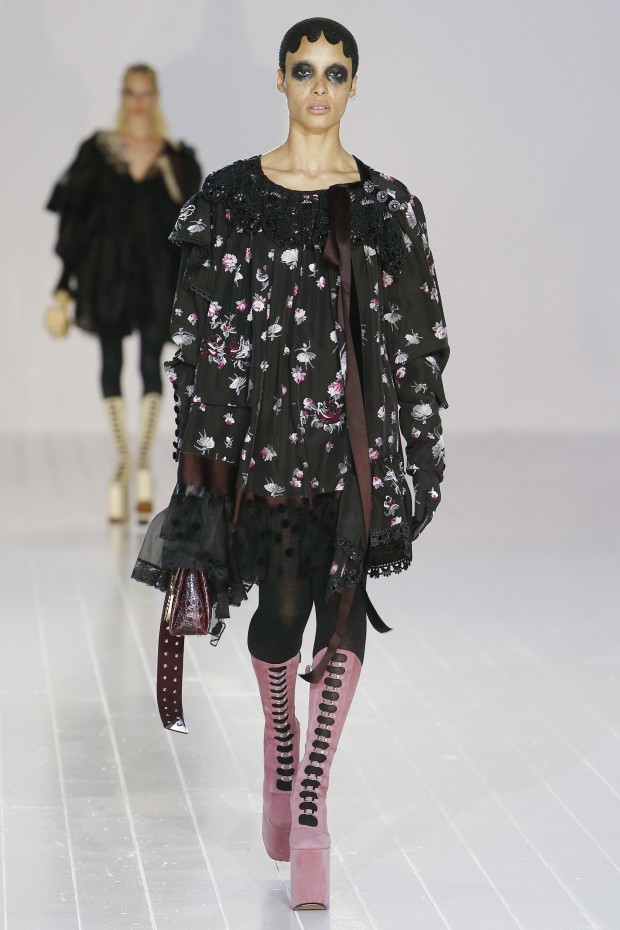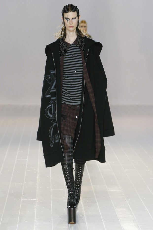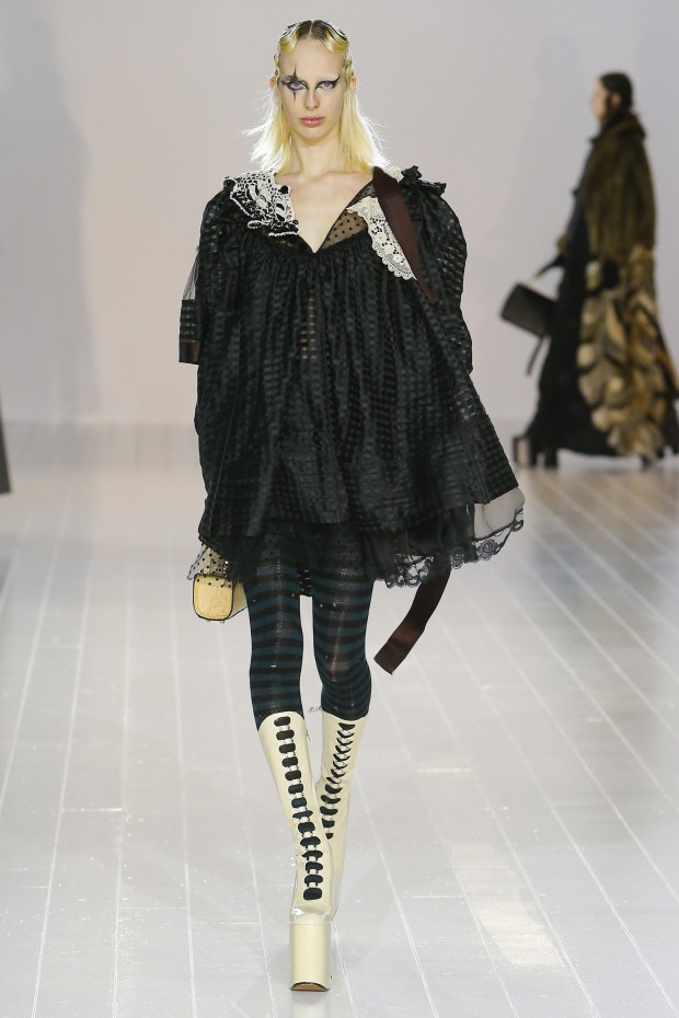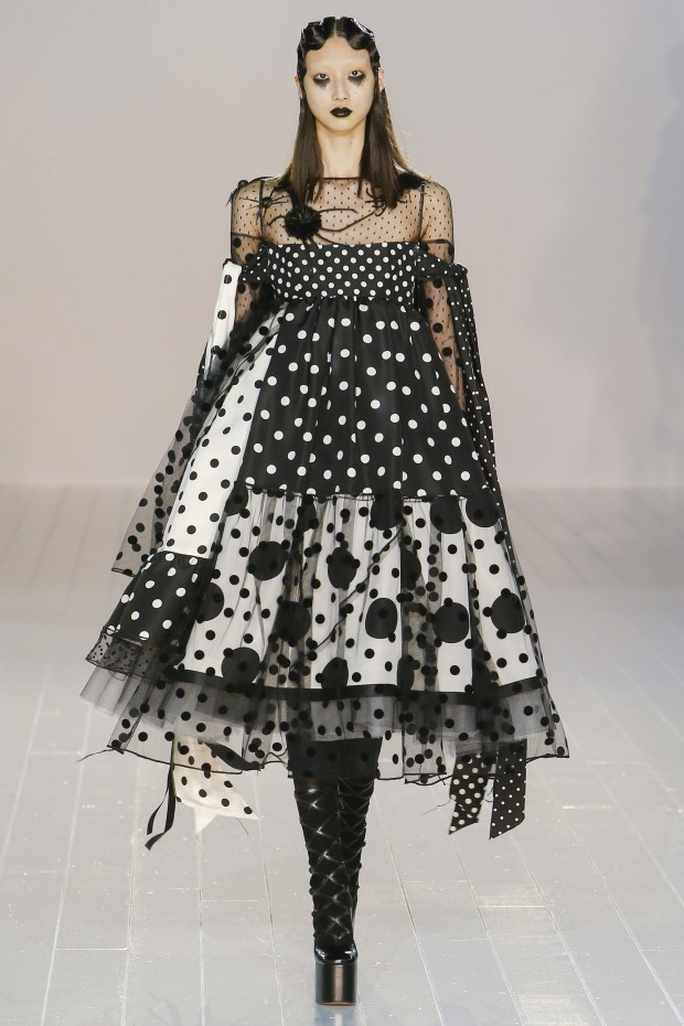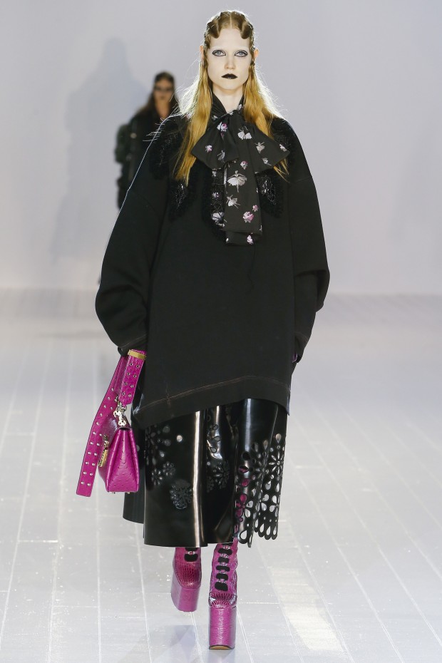 Уже с первого образа на подиуме стало ясно, что коллекция осень-зима 2016 будет невероятной и наполненной множеством отсылок. Угольно-черный лайнер вокруг глаз, такого же цвета губы, зачесанные в стиле 20-х волосы, свитшот с изображением рок-группы, вывязанный воротник, длинная юбка поверх кринолина, 30-сантиметровая платформа — и все это только в первом образе. Дальше — больше. Викторианские юбки, либо блестящие, либо с лазерной перфорацией, сочетались с женственными блузами с бантами вместо галстуков, без которых в 2016 году не обойдется ни одна модница. Меховые пальто выглядели так, словно были результатом безжалостной охоты на остатки былой роскоши на какой-нибудь благотворительной распродаже — многослойные и сшитые из множества разномастных кусков. Черно-белый горох напоминал о коллекции Марка Джейкобса весна-лето 2013, посвященной Эдди Сэджвик, а длинные кейпы отсылали к стилю Дианы Вриланд, к которому он обращался ровно год назад. Игнорируя классические силуэты, дизайнер бесцеремонно увеличивал верхнюю одежду и регланы до неприличия, а некоторые из них, наоборот, уменьшал до невозможности. Он играл с текстурами, сочетая прозрачное платье с косухой, отделанной мехом, а юбки из мерцающей тафты — с перьями. Ему удалось даже подружить крыс и котов, соединив их в одном принте на платьях. А мрачные готические цвета Марк Джейкобс разбавлял редкими вкраплениями розового, бежевого и фиолетового.
