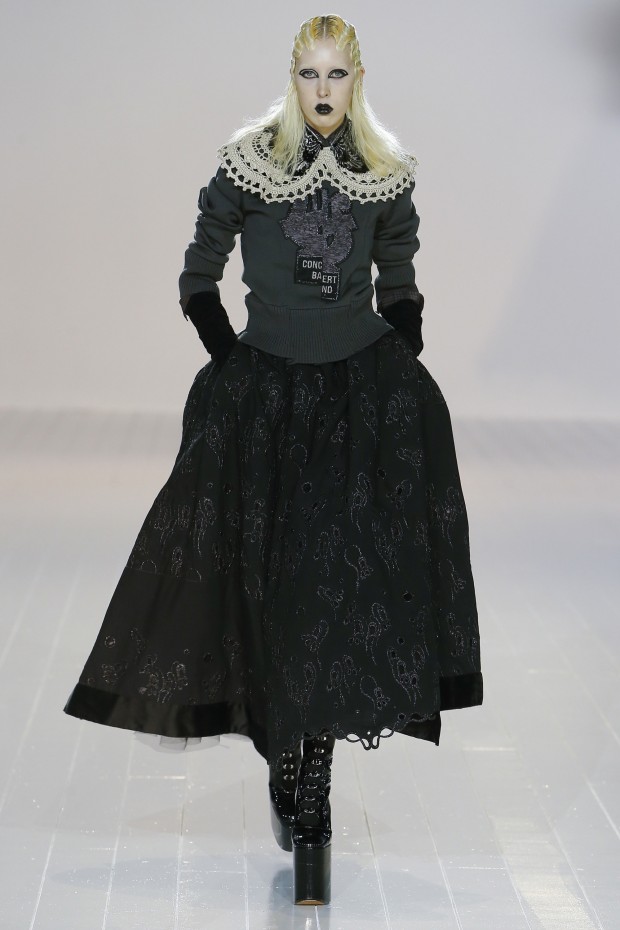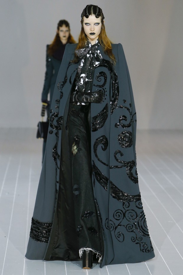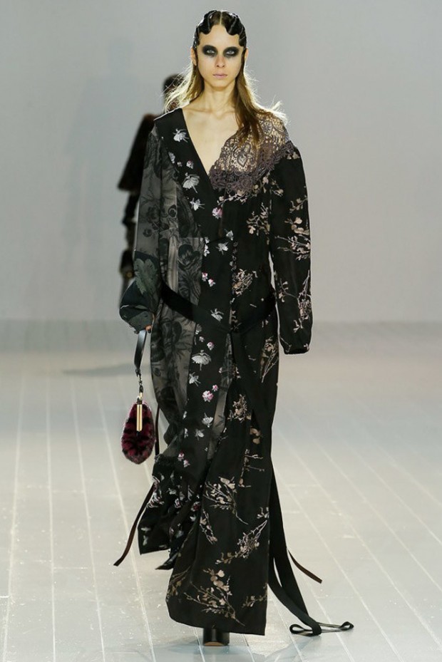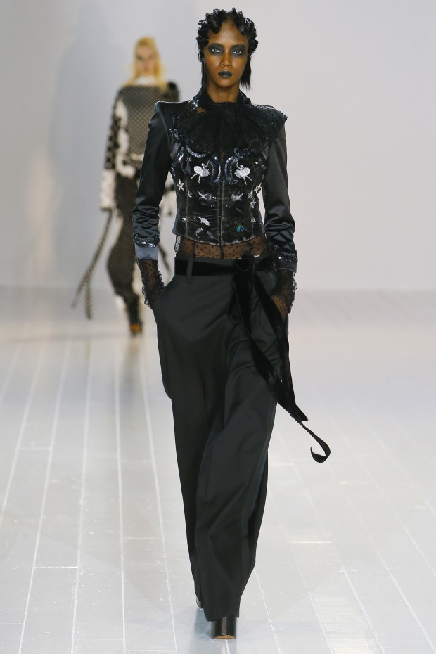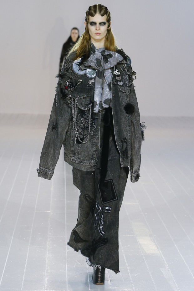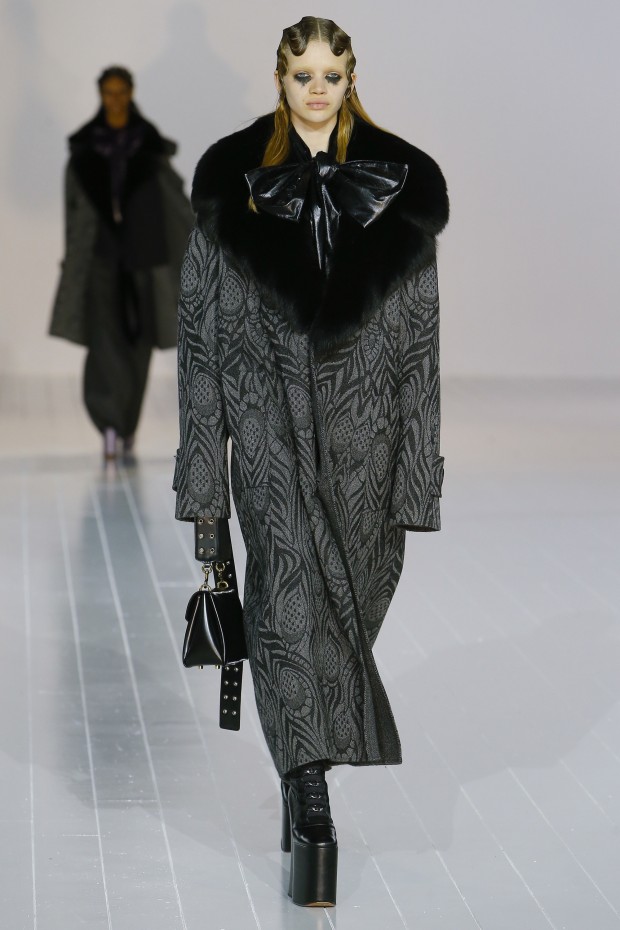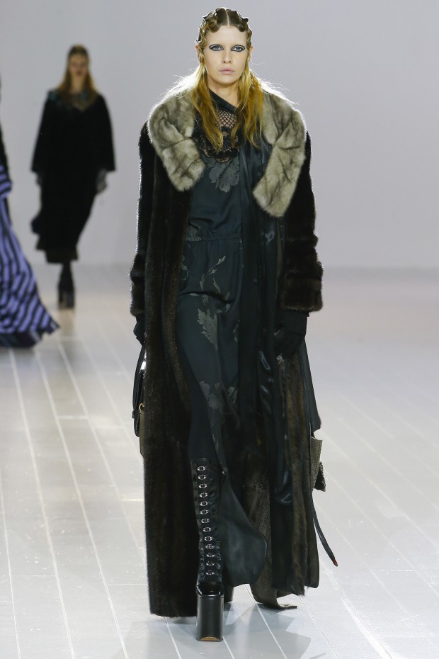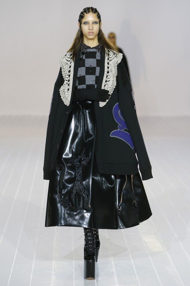 Уже с первого образа на подиуме стало ясно, что коллекция осень-зима 2016 будет невероятной и наполненной множеством отсылок. Угольно-черный лайнер вокруг глаз, такого же цвета губы, зачесанные в стиле 20-х волосы, свитшот с изображением рок-группы, вывязанный воротник, длинная юбка поверх кринолина, 30-сантиметровая платформа — и все это только в первом образе. Дальше — больше. Викторианские юбки, либо блестящие, либо с лазерной перфорацией, сочетались с женственными блузами с бантами вместо галстуков, без которых в 2016 году не обойдется ни одна модница. Меховые пальто выглядели так, словно были результатом безжалостной охоты на остатки былой роскоши на какой-нибудь благотворительной распродаже — многослойные и сшитые из множества разномастных кусков. Черно-белый горох напоминал о коллекции Марка Джейкобса весна-лето 2013, посвященной Эдди Сэджвик, а длинные кейпы отсылали к стилю Дианы Вриланд, к которому он обращался ровно год назад. Игнорируя классические силуэты, дизайнер бесцеремонно увеличивал верхнюю одежду и регланы до неприличия, а некоторые из них, наоборот, уменьшал до невозможности. Он играл с текстурами, сочетая прозрачное платье с косухой, отделанной мехом, а юбки из мерцающей тафты — с перьями. Ему удалось даже подружить крыс и котов, соединив их в одном принте на платьях. А мрачные готические цвета Марк Джейкобс разбавлял редкими вкраплениями розового, бежевого и фиолетового.
