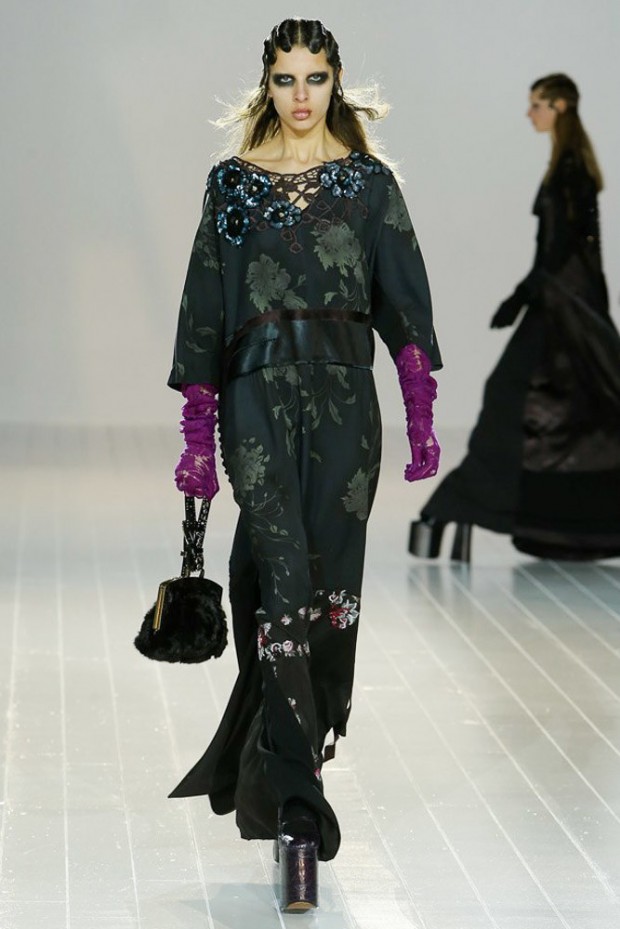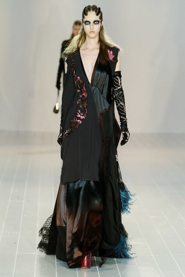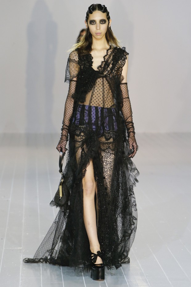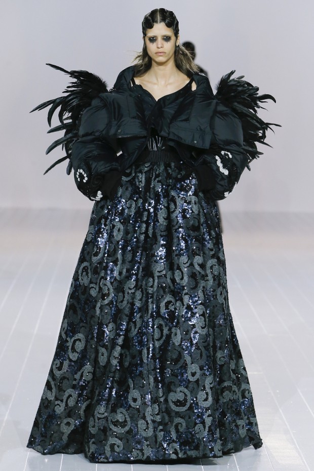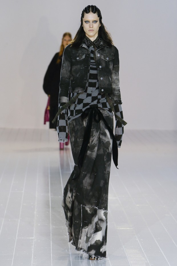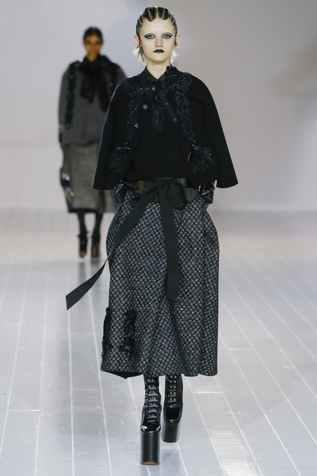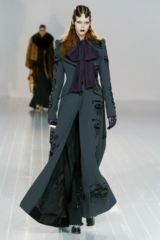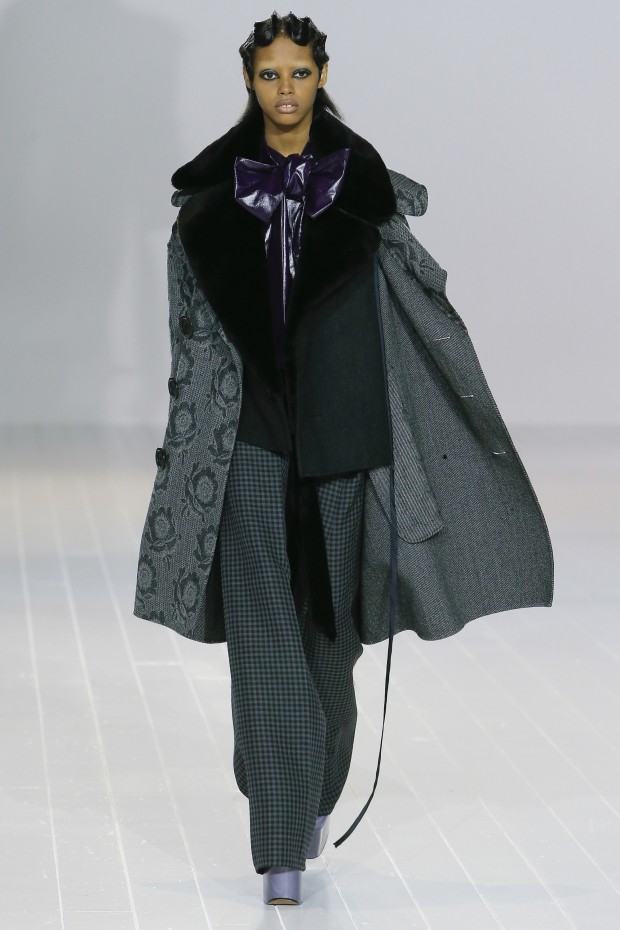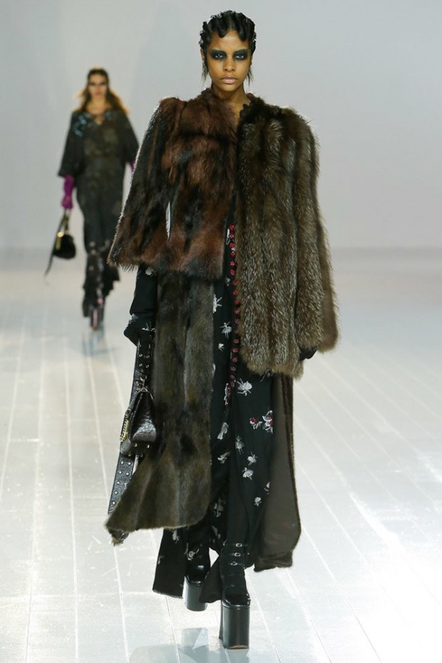 Уже с первого образа на подиуме стало ясно, что коллекция осень-зима 2016 будет невероятной и наполненной множеством отсылок. Угольно-черный лайнер вокруг глаз, такого же цвета губы, зачесанные в стиле 20-х волосы, свитшот с изображением рок-группы, вывязанный воротник, длинная юбка поверх кринолина, 30-сантиметровая платформа — и все это только в первом образе. Дальше — больше. Викторианские юбки, либо блестящие, либо с лазерной перфорацией, сочетались с женственными блузами с бантами вместо галстуков, без которых в 2016 году не обойдется ни одна модница. Меховые пальто выглядели так, словно были результатом безжалостной охоты на остатки былой роскоши на какой-нибудь благотворительной распродаже — многослойные и сшитые из множества разномастных кусков. Черно-белый горох напоминал о коллекции Марка Джейкобса весна-лето 2013, посвященной Эдди Сэджвик, а длинные кейпы отсылали к стилю Дианы Вриланд, к которому он обращался ровно год назад. Игнорируя классические силуэты, дизайнер бесцеремонно увеличивал верхнюю одежду и регланы до неприличия, а некоторые из них, наоборот, уменьшал до невозможности. Он играл с текстурами, сочетая прозрачное платье с косухой, отделанной мехом, а юбки из мерцающей тафты — с перьями. Ему удалось даже подружить крыс и котов, соединив их в одном принте на платьях. А мрачные готические цвета Марк Джейкобс разбавлял редкими вкраплениями розового, бежевого и фиолетового.