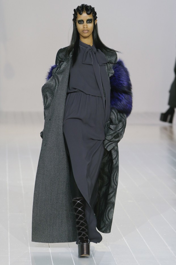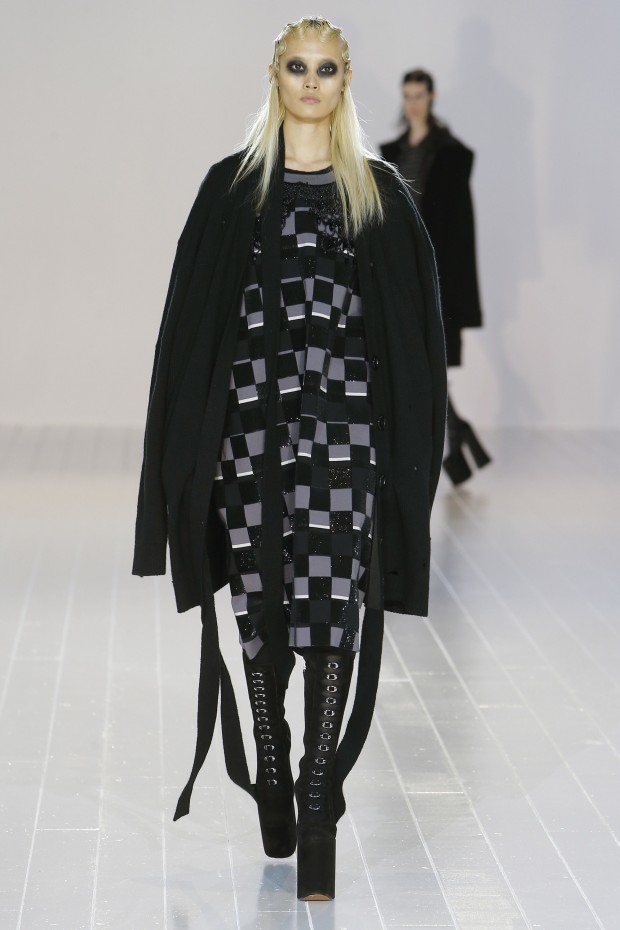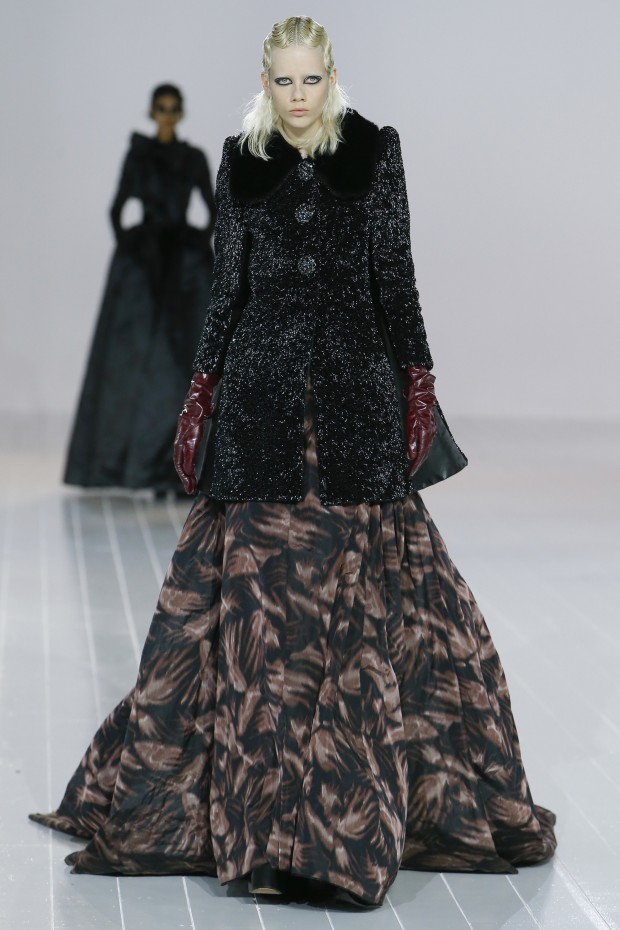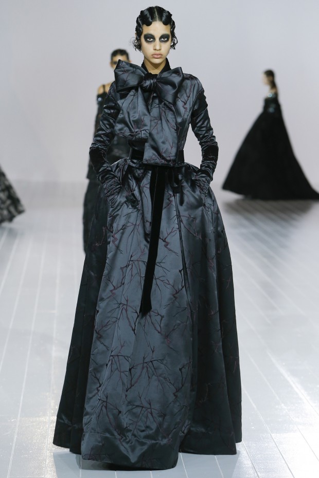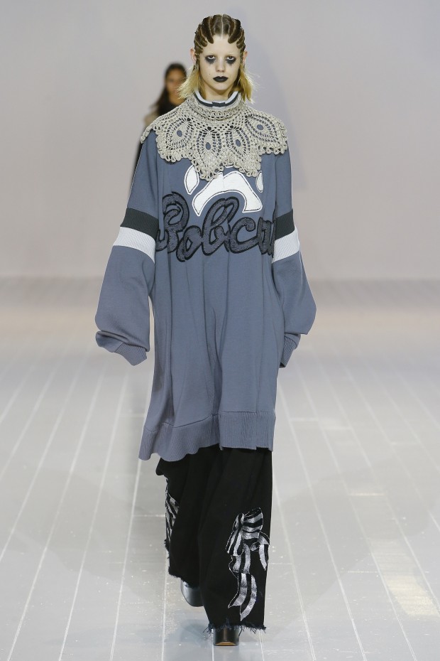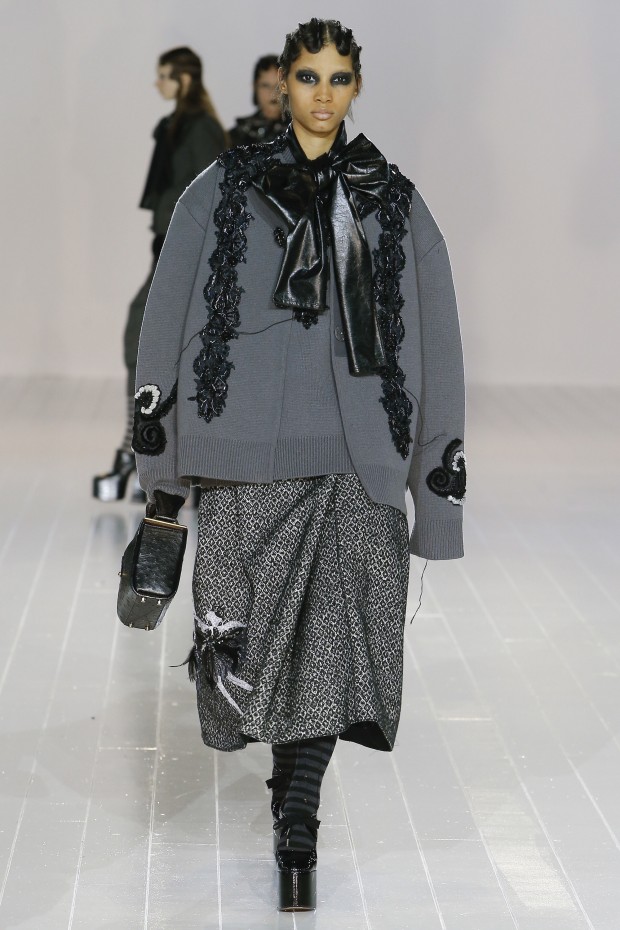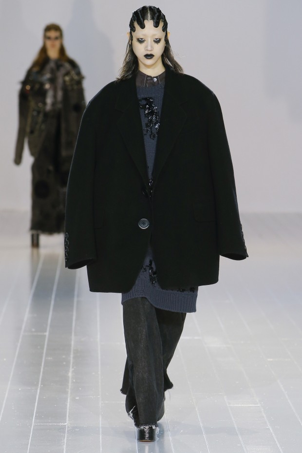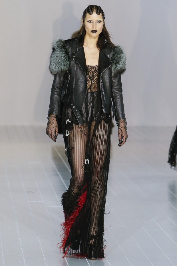 Уже с первого образа на подиуме стало ясно, что коллекция осень-зима 2016 будет невероятной и наполненной множеством отсылок. Угольно-черный лайнер вокруг глаз, такого же цвета губы, зачесанные в стиле 20-х волосы, свитшот с изображением рок-группы, вывязанный воротник, длинная юбка поверх кринолина, 30-сантиметровая платформа — и все это только в первом образе. Дальше — больше. Викторианские юбки, либо блестящие, либо с лазерной перфорацией, сочетались с женственными блузами с бантами вместо галстуков, без которых в 2016 году не обойдется ни одна модница. Меховые пальто выглядели так, словно были результатом безжалостной охоты на остатки былой роскоши на какой-нибудь благотворительной распродаже — многослойные и сшитые из множества разномастных кусков. Черно-белый горох напоминал о коллекции Марка Джейкобса весна-лето 2013, посвященной Эдди Сэджвик, а длинные кейпы отсылали к стилю Дианы Вриланд, к которому он обращался ровно год назад. Игнорируя классические силуэты, дизайнер бесцеремонно увеличивал верхнюю одежду и регланы до неприличия, а некоторые из них, наоборот, уменьшал до невозможности. Он играл с текстурами, сочетая прозрачное платье с косухой, отделанной мехом, а юбки из мерцающей тафты — с перьями. Ему удалось даже подружить крыс и котов, соединив их в одном принте на платьях. А мрачные готические цвета Марк Джейкобс разбавлял редкими вкраплениями розового, бежевого и фиолетового.