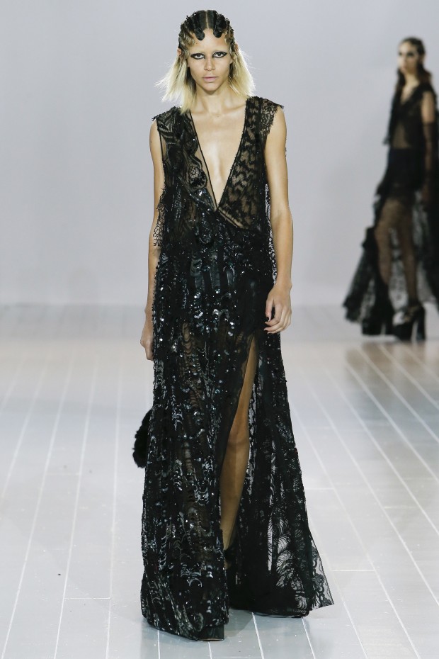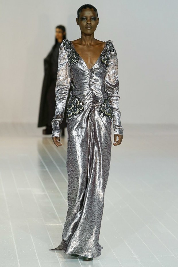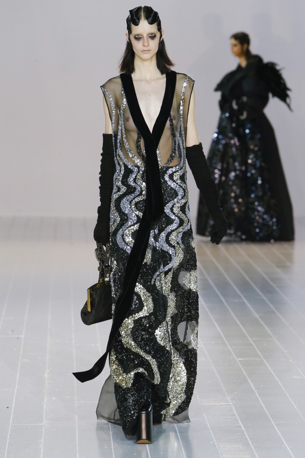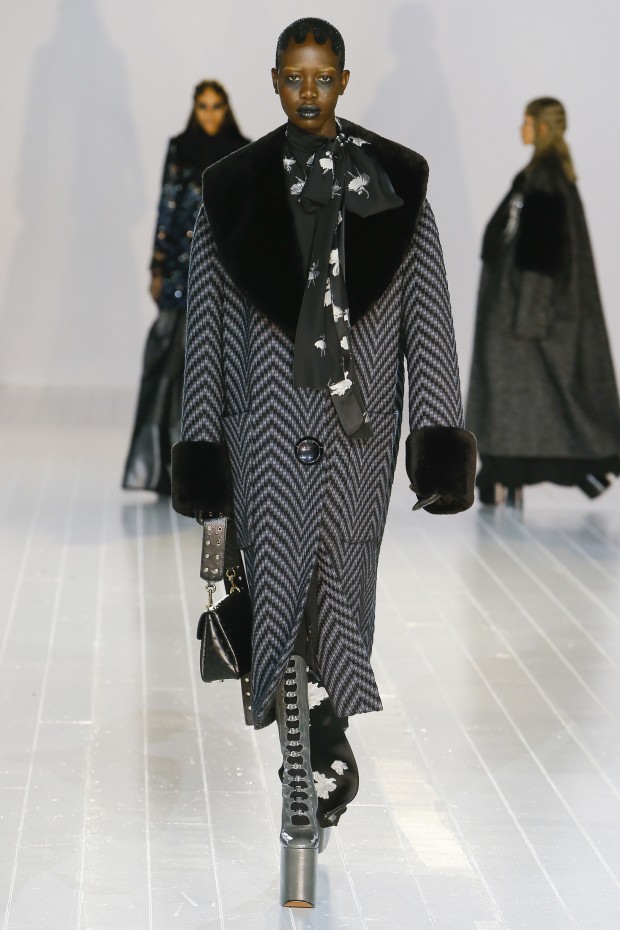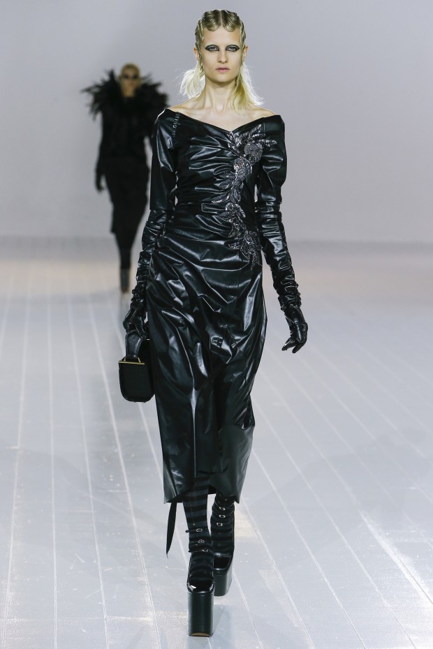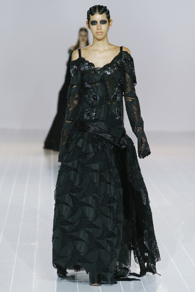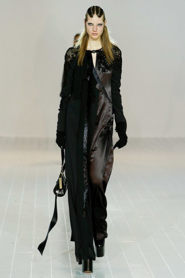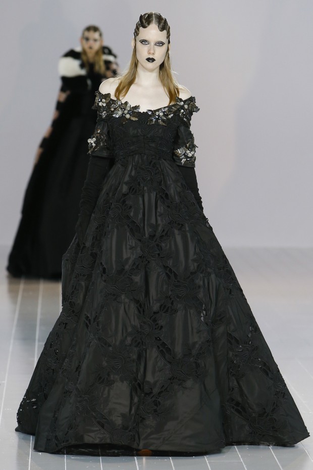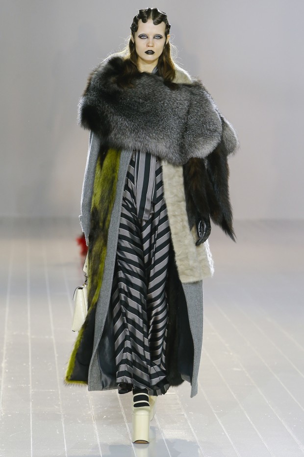 Уже с первого образа на подиуме стало ясно, что коллекция осень-зима 2016 будет невероятной и наполненной множеством отсылок. Угольно-черный лайнер вокруг глаз, такого же цвета губы, зачесанные в стиле 20-х волосы, свитшот с изображением рок-группы, вывязанный воротник, длинная юбка поверх кринолина, 30-сантиметровая платформа — и все это только в первом образе. Дальше — больше. Викторианские юбки, либо блестящие, либо с лазерной перфорацией, сочетались с женственными блузами с бантами вместо галстуков, без которых в 2016 году не обойдется ни одна модница. Меховые пальто выглядели так, словно были результатом безжалостной охоты на остатки былой роскоши на какой-нибудь благотворительной распродаже — многослойные и сшитые из множества разномастных кусков. Черно-белый горох напоминал о коллекции Марка Джейкобса весна-лето 2013, посвященной Эдди Сэджвик, а длинные кейпы отсылали к стилю Дианы Вриланд, к которому он обращался ровно год назад. Игнорируя классические силуэты, дизайнер бесцеремонно увеличивал верхнюю одежду и регланы до неприличия, а некоторые из них, наоборот, уменьшал до невозможности. Он играл с текстурами, сочетая прозрачное платье с косухой, отделанной мехом, а юбки из мерцающей тафты — с перьями. Ему удалось даже подружить крыс и котов, соединив их в одном принте на платьях. А мрачные готические цвета Марк Джейкобс разбавлял редкими вкраплениями розового, бежевого и фиолетового.