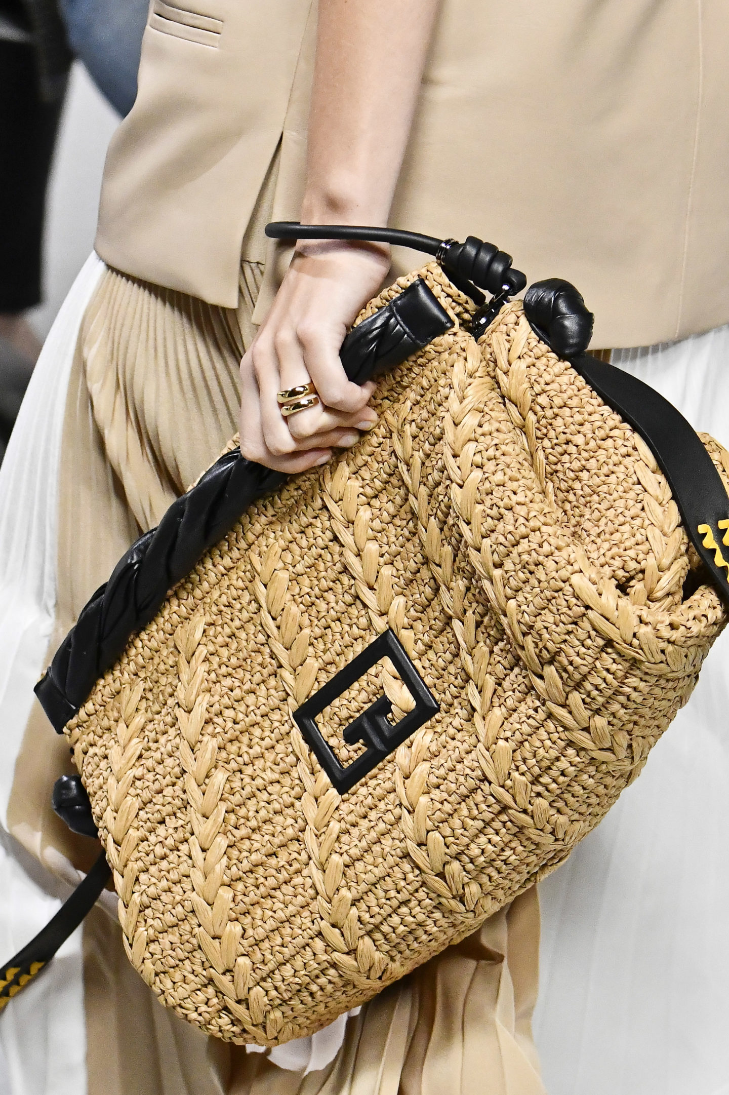 Плетение вошло в моду благодаря Bottega Veneta. Такой узор из кожи лежит в основе ДНК бренда. Другие же сиюминутно подхватили этот тренд. Ввиду большей сосредоточенности на устойчивом развитии и популяризации образа в стиле «дитя природы» сумки с натуральными элементами из рафии будут на пике популярности в этом сезоне.