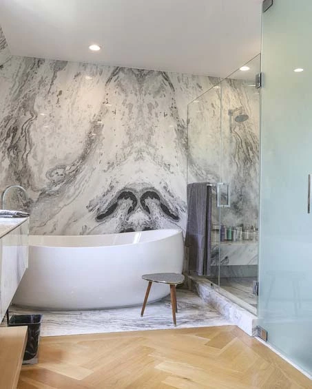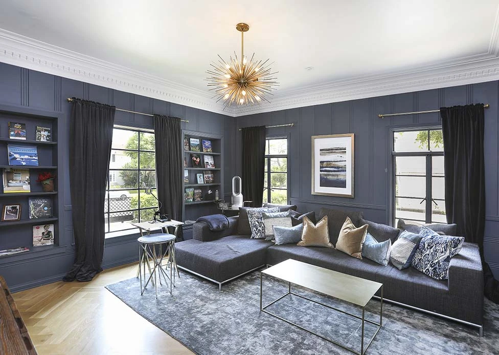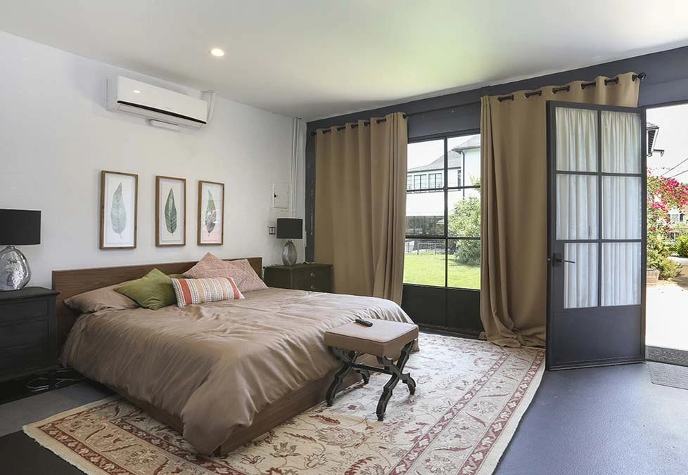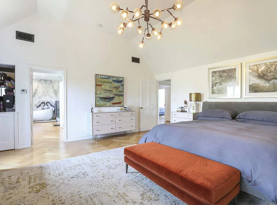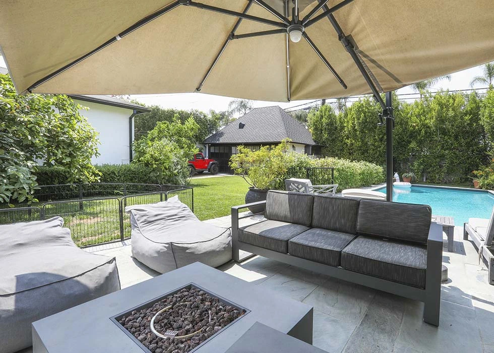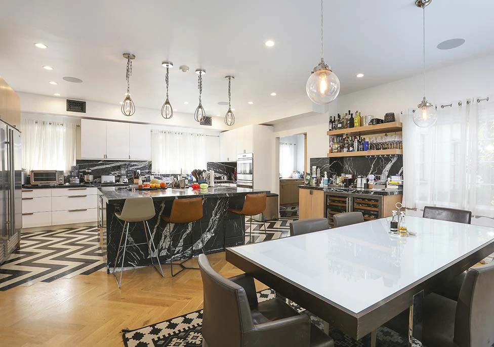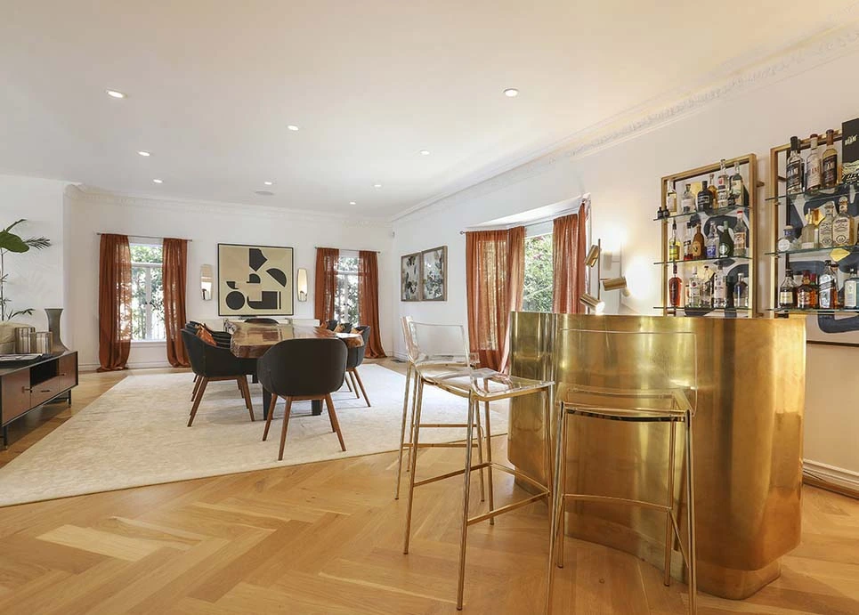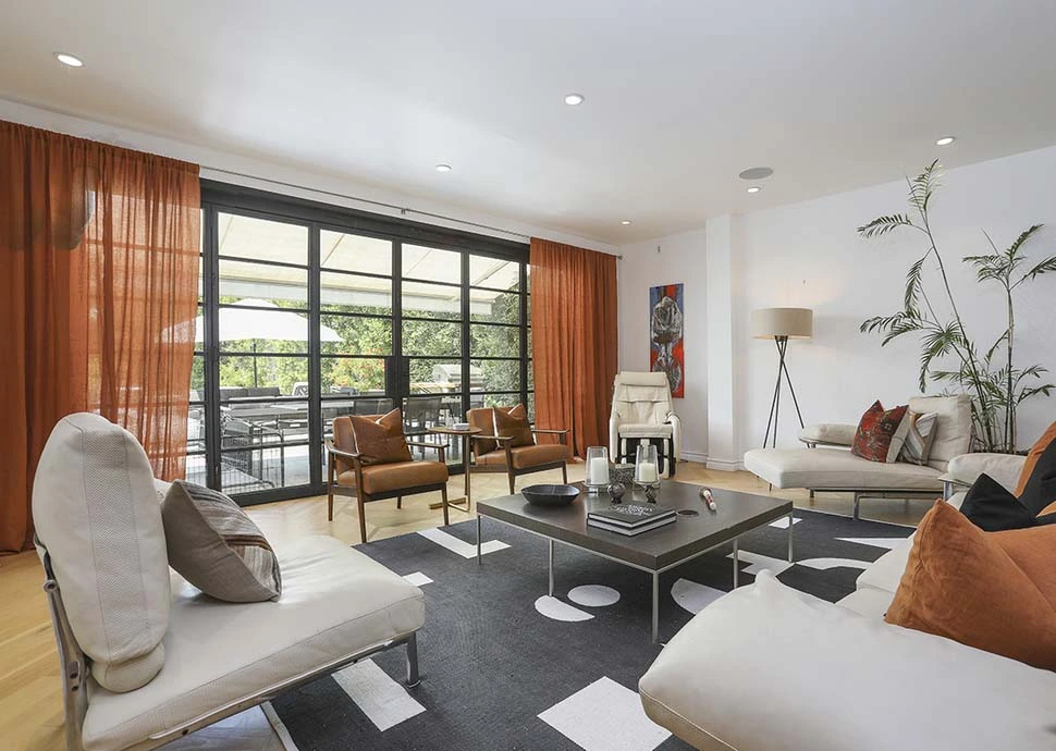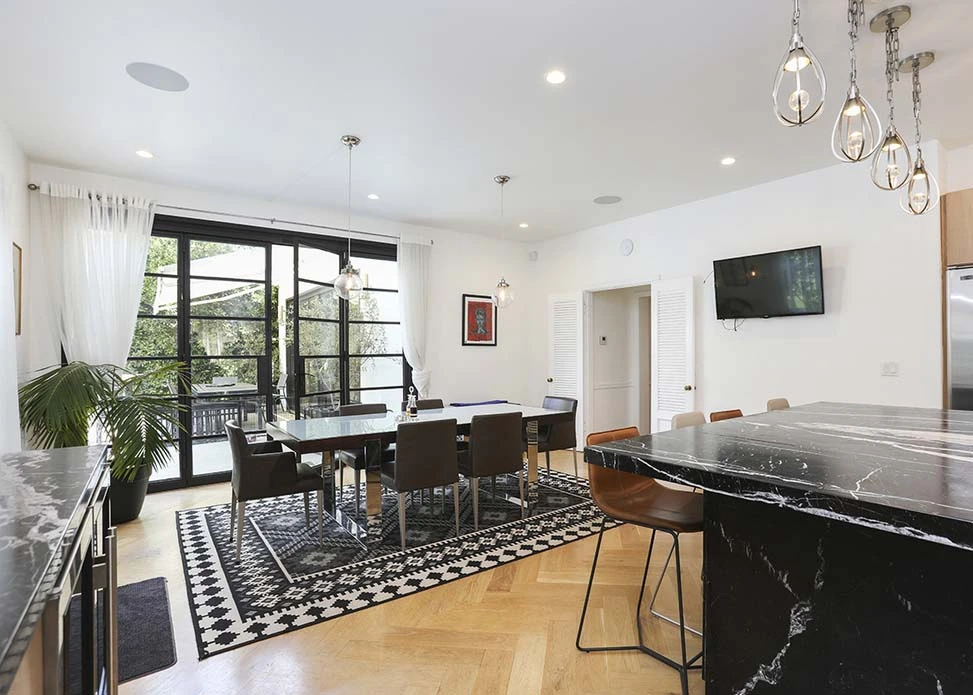 Несмотря на то, что дом построен давно, его полностью модернизировали. Так интерьер украшен мраморными элементами и современными светильниками, а кухня оснащена высококачественной бытовой техникой из нержавеющей стали, включая два холодильника для вина. На нижнем этаже размещены комнаты для отдыха и релакса, а двери выходят на открытую лаунж-зону с бассейном и местом для костра. Рядом с главным домом размещен гостевой, выполненный в том же стиле, а вокруг территории высажена высокая живая изгородь.