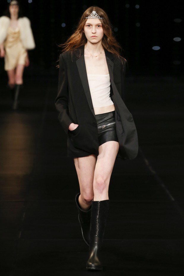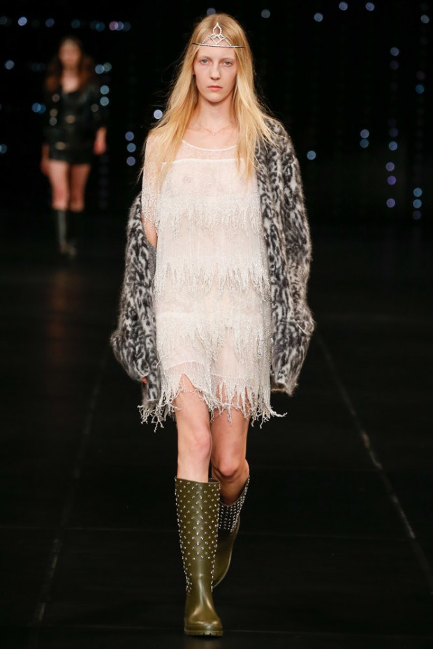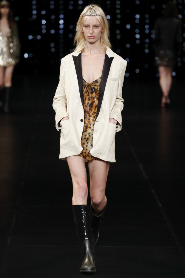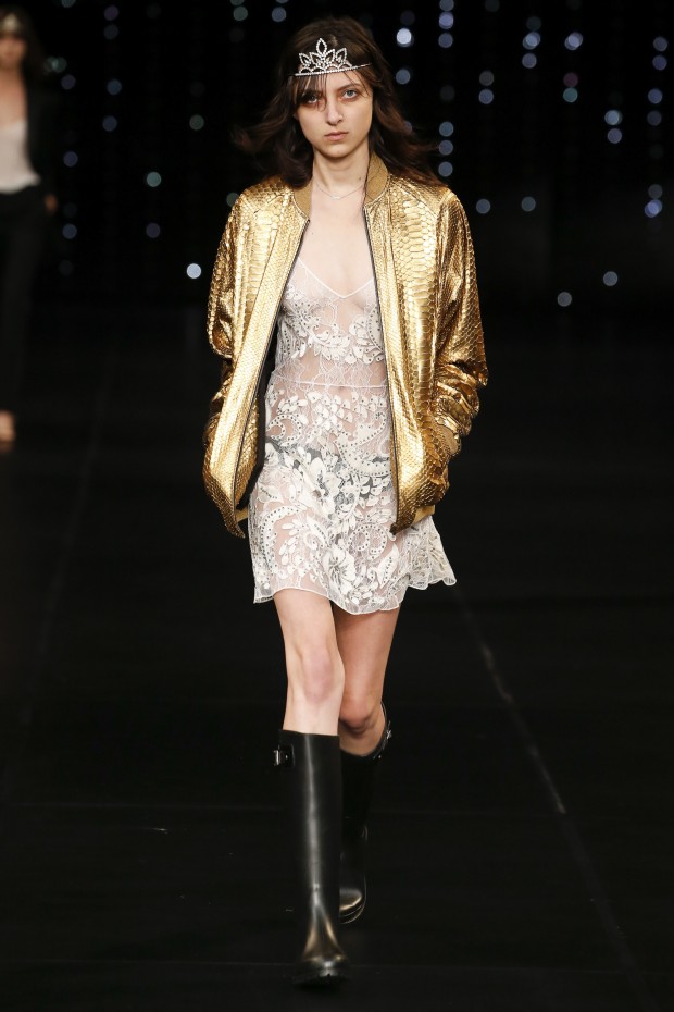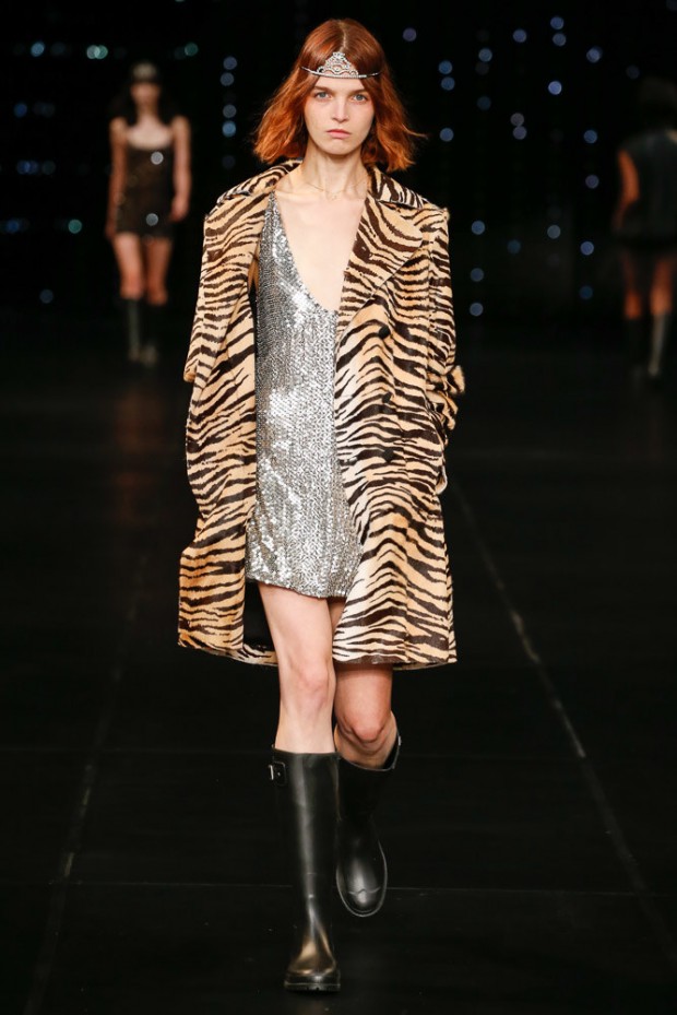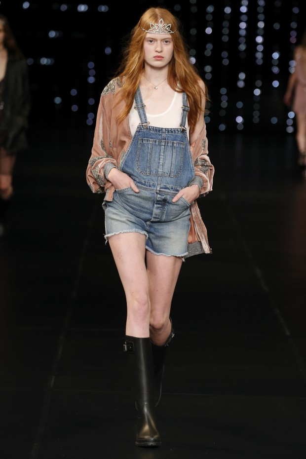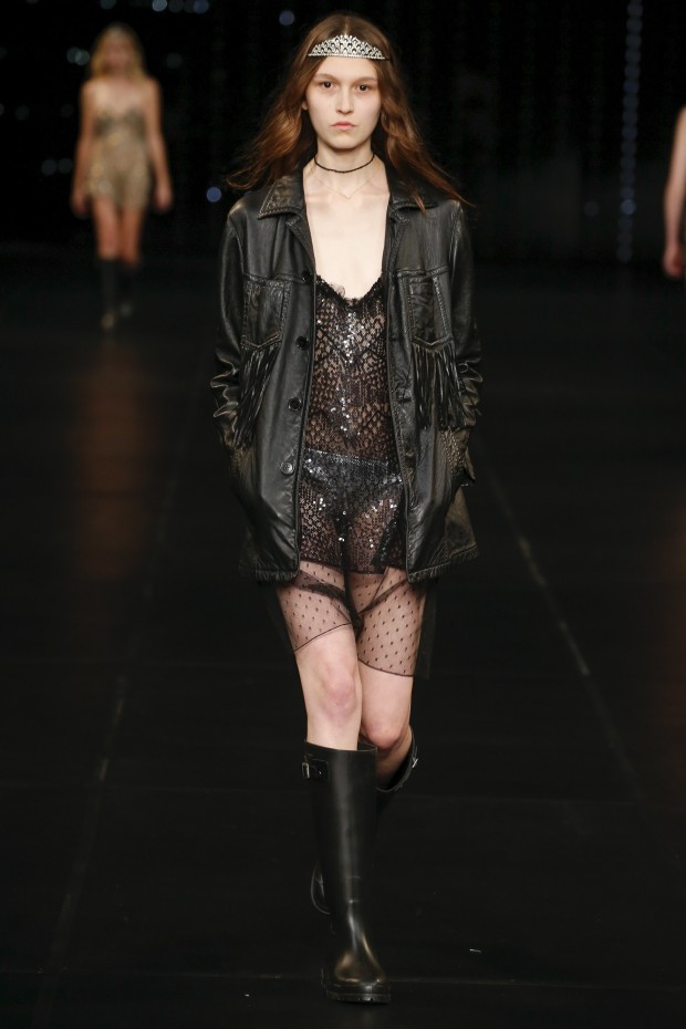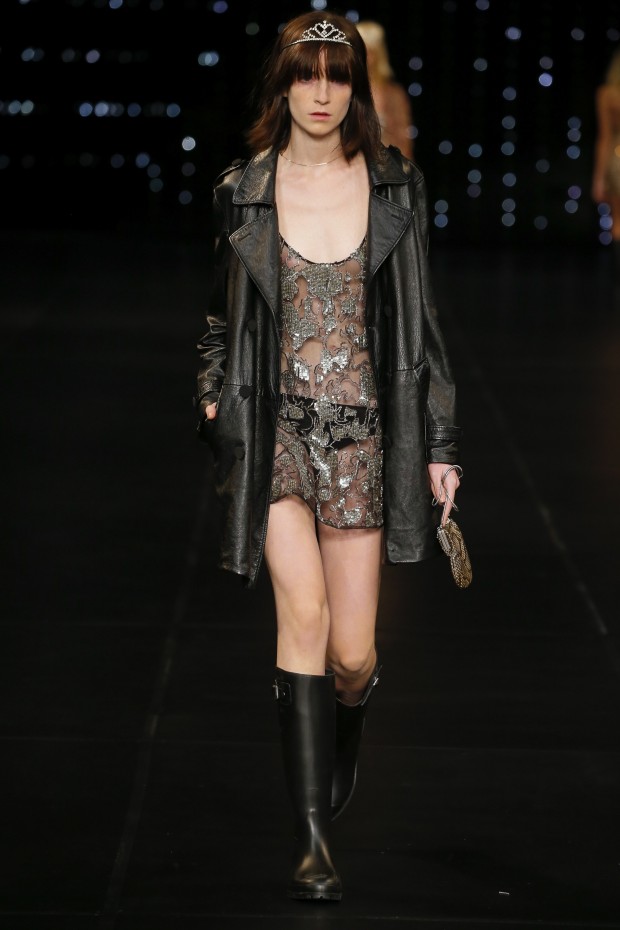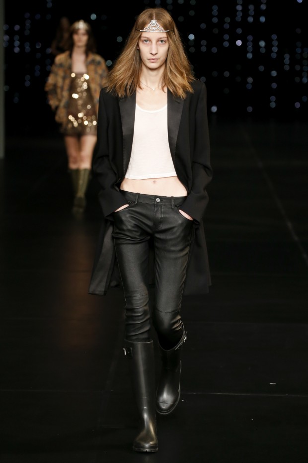 Грубые куртки из джинса и кожи, леопардовые принты, резиновые сапоги и мех создавали контраст будуарным полупрозрачным платьям, которые были умышленно велики моделям и сползали с плеч. Не обошелся Эди Слиман в коллекции и без классики Saint Laurent — идеально скроенных смокингов и жакетов, среди которых неожиданным образом затесался бежевый тренч. Еще одним взглядом в прошлое стали вещи из денима — куртки, комбинезоны, мини-юбки и шорты, выглядящие так, словно были куплены примерно 20 лет назад. Завершали показ несколько классических вечерних платьев разного кроя, без которых брендам Kering теперь не обойтись — контракт с Каннским кинофестивалем должен быть взаимовыгодным, и платья Saint Laurent Paris наверняка будут на красной дорожке в следующем году.