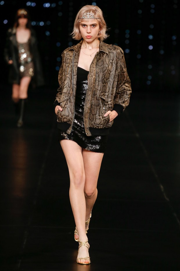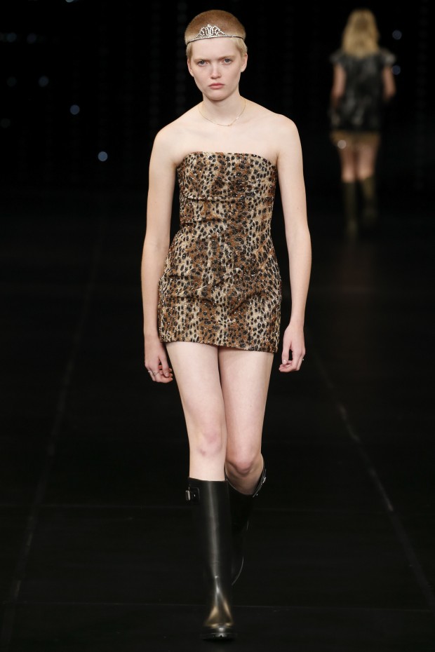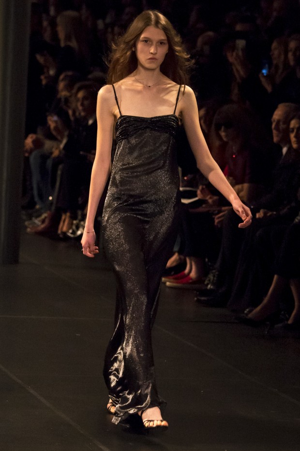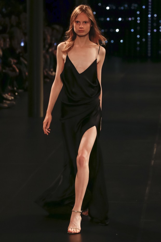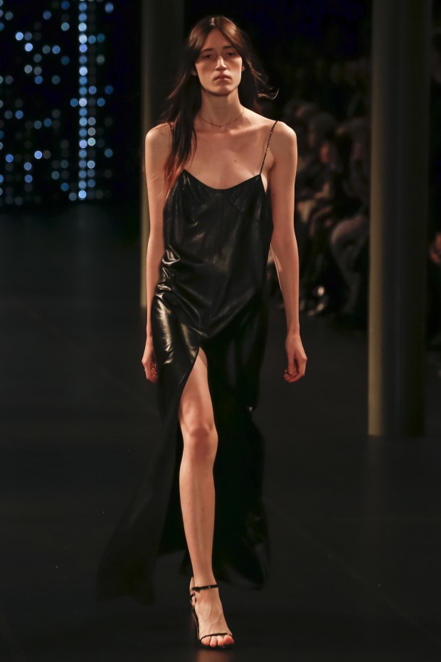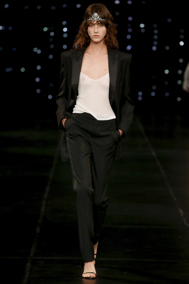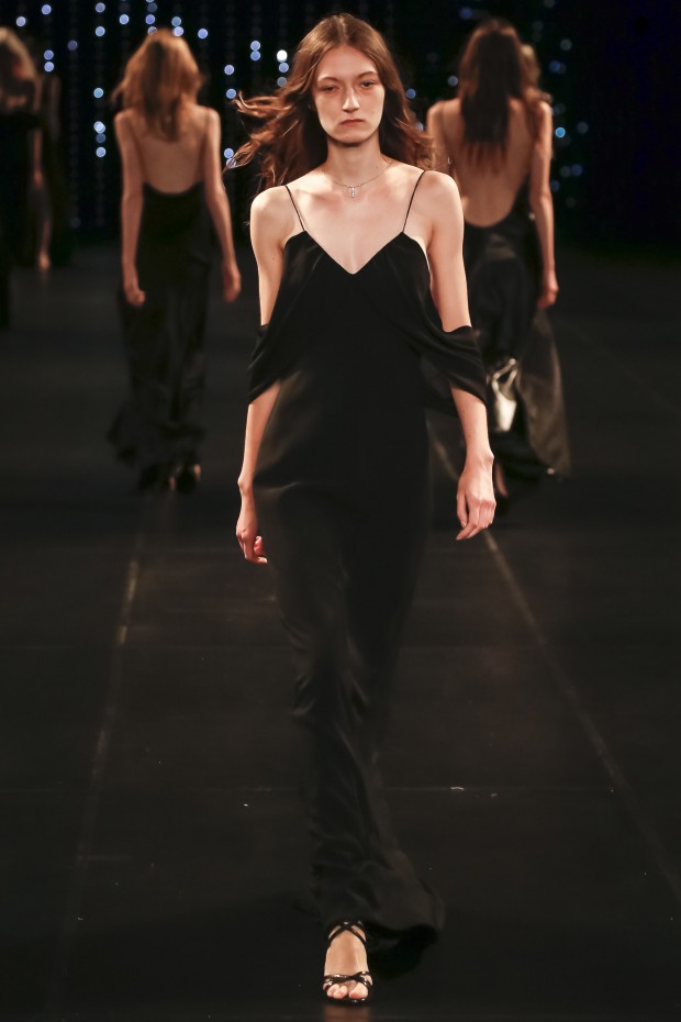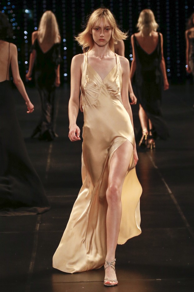 Грубые куртки из джинса и кожи, леопардовые принты, резиновые сапоги и мех создавали контраст будуарным полупрозрачным платьям, которые были умышленно велики моделям и сползали с плеч. Не обошелся Эди Слиман в коллекции и без классики Saint Laurent — идеально скроенных смокингов и жакетов, среди которых неожиданным образом затесался бежевый тренч. Еще одним взглядом в прошлое стали вещи из денима — куртки, комбинезоны, мини-юбки и шорты, выглядящие так, словно были куплены примерно 20 лет назад. Завершали показ несколько классических вечерних платьев разного кроя, без которых брендам Kering теперь не обойтись — контракт с Каннским кинофестивалем должен быть взаимовыгодным, и платья Saint Laurent Paris наверняка будут на красной дорожке в следующем году.
