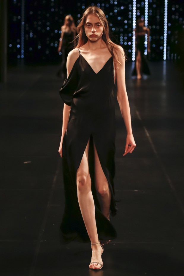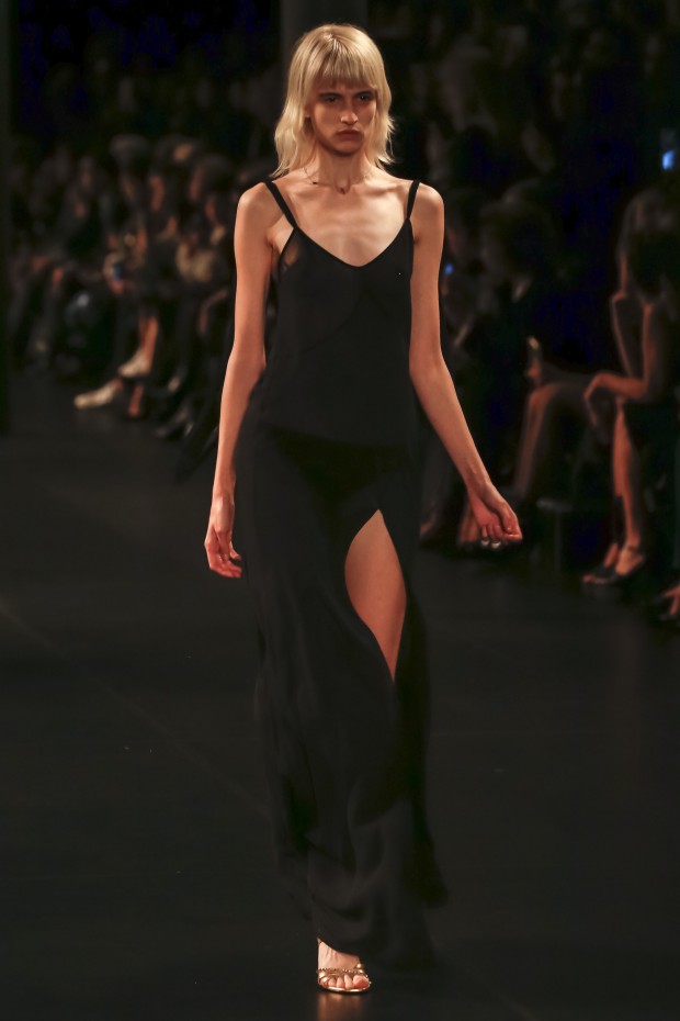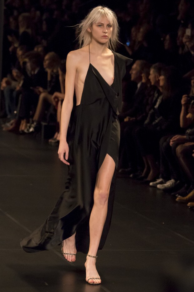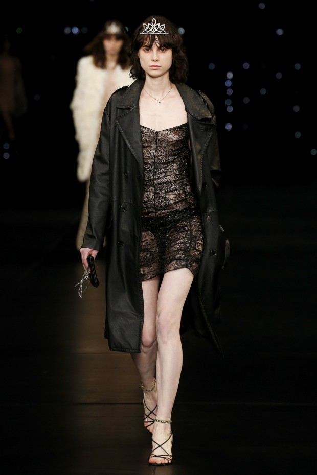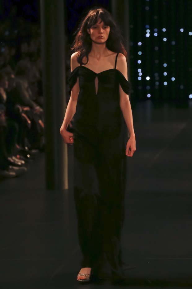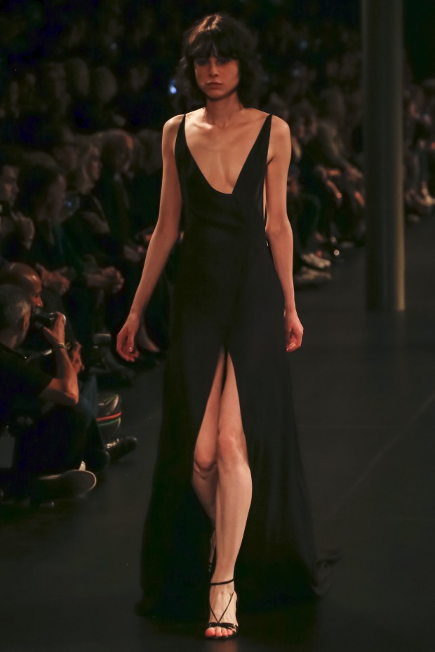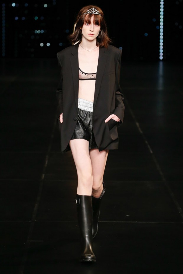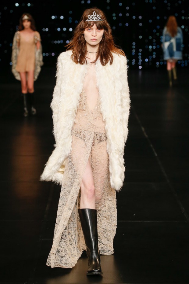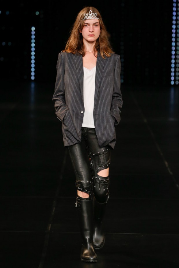 Грубые куртки из джинса и кожи, леопардовые принты, резиновые сапоги и мех создавали контраст будуарным полупрозрачным платьям, которые были умышленно велики моделям и сползали с плеч. Не обошелся Эди Слиман в коллекции и без классики Saint Laurent — идеально скроенных смокингов и жакетов, среди которых неожиданным образом затесался бежевый тренч. Еще одним взглядом в прошлое стали вещи из денима — куртки, комбинезоны, мини-юбки и шорты, выглядящие так, словно были куплены примерно 20 лет назад. Завершали показ несколько классических вечерних платьев разного кроя, без которых брендам Kering теперь не обойтись — контракт с Каннским кинофестивалем должен быть взаимовыгодным, и платья Saint Laurent Paris наверняка будут на красной дорожке в следующем году.