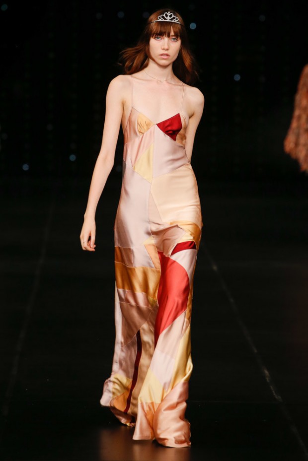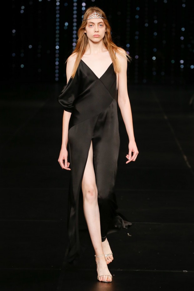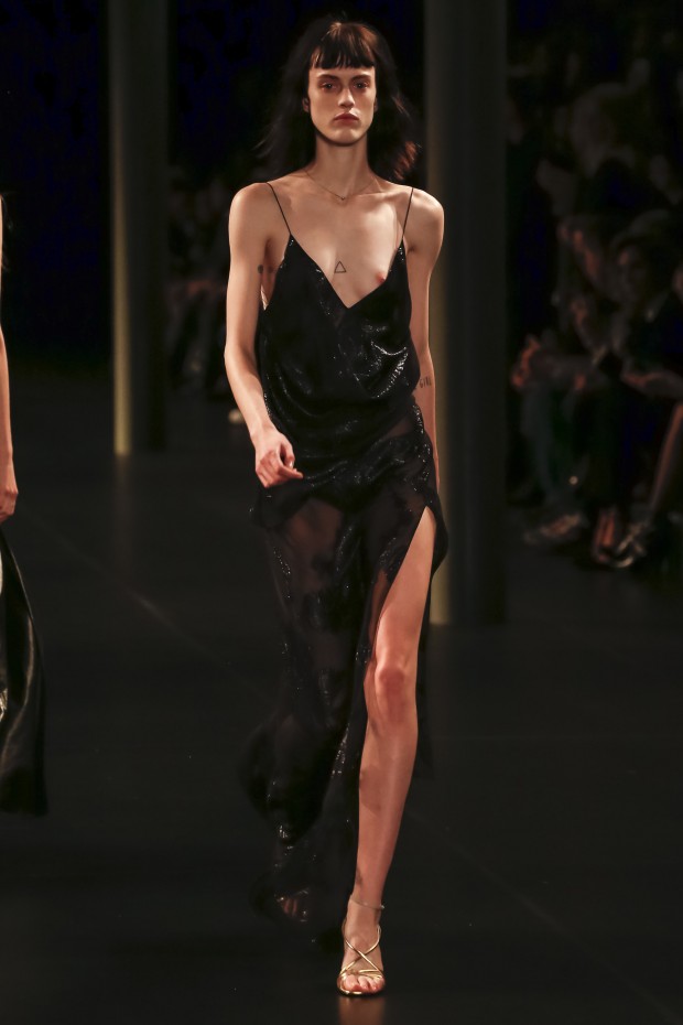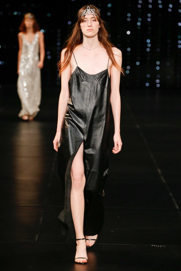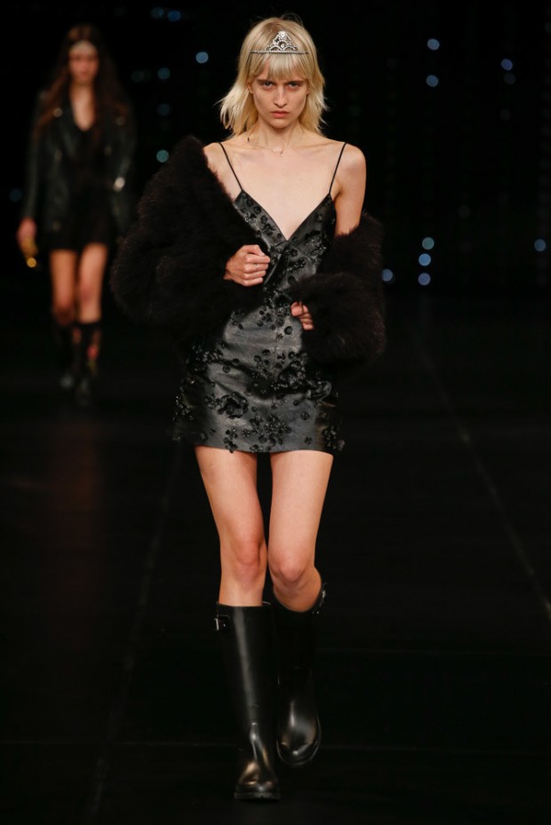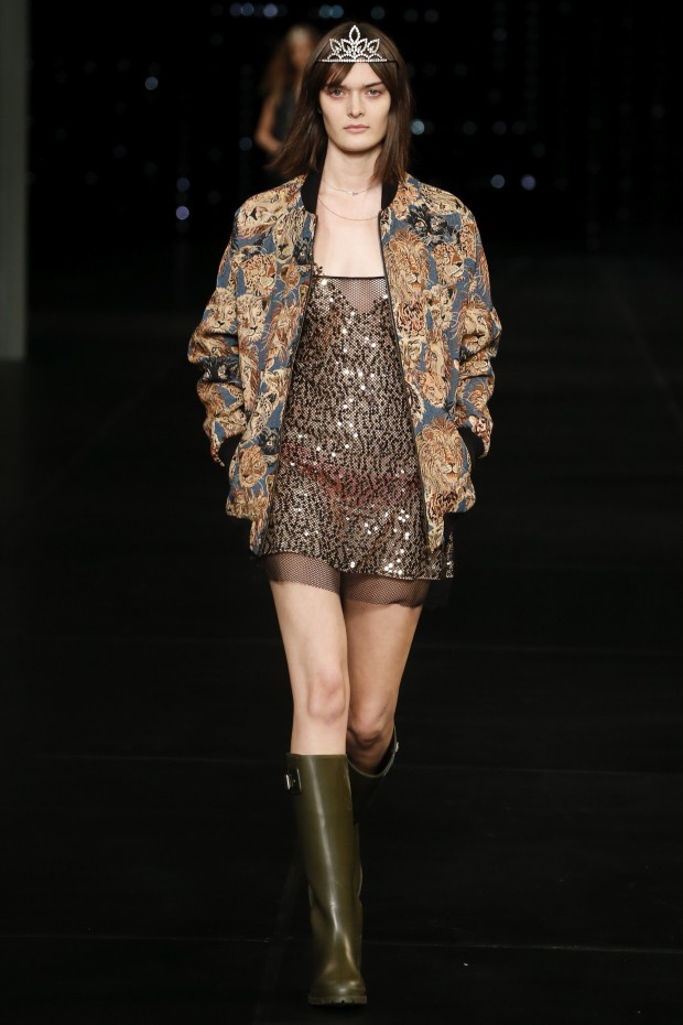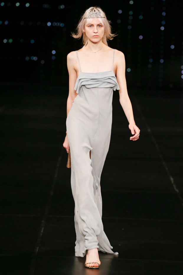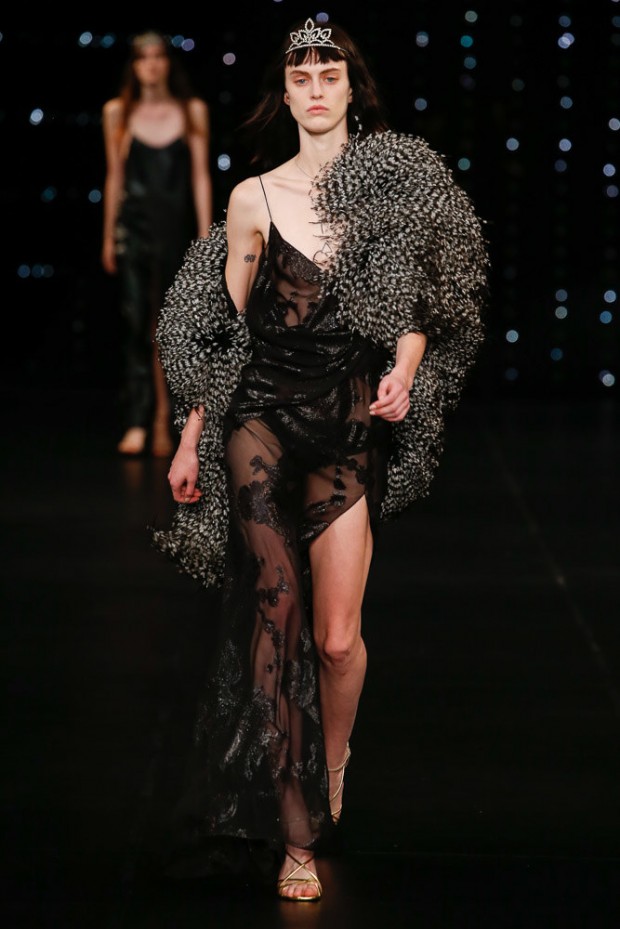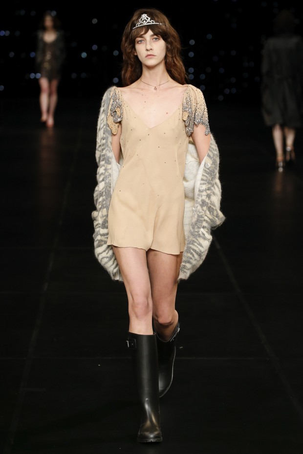 Сложно не догадаться, что главной музой коллекции стала Кейт Мосс и ее легендарное появление в блестящем длинном платье на тонких бретелях в 90-х — таких платьев в коллекции было предостаточно. «Вы же знаете, я всегда предпочитал плохих девочек», — поделился дизайнер после показа, таким своеобразным способом оправдываясь за наличие диадем на головах моделей. Нет, он явно не хотел сделать героиню коллекции похожей на принцессу — она точно родом из гранжевых 90-х, только выглядит чуть более опрятно и блестяще.