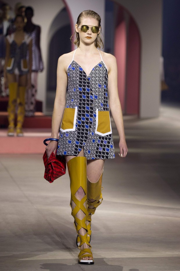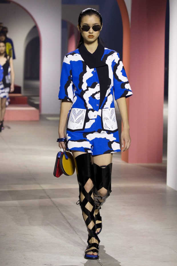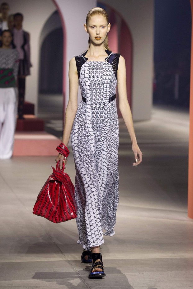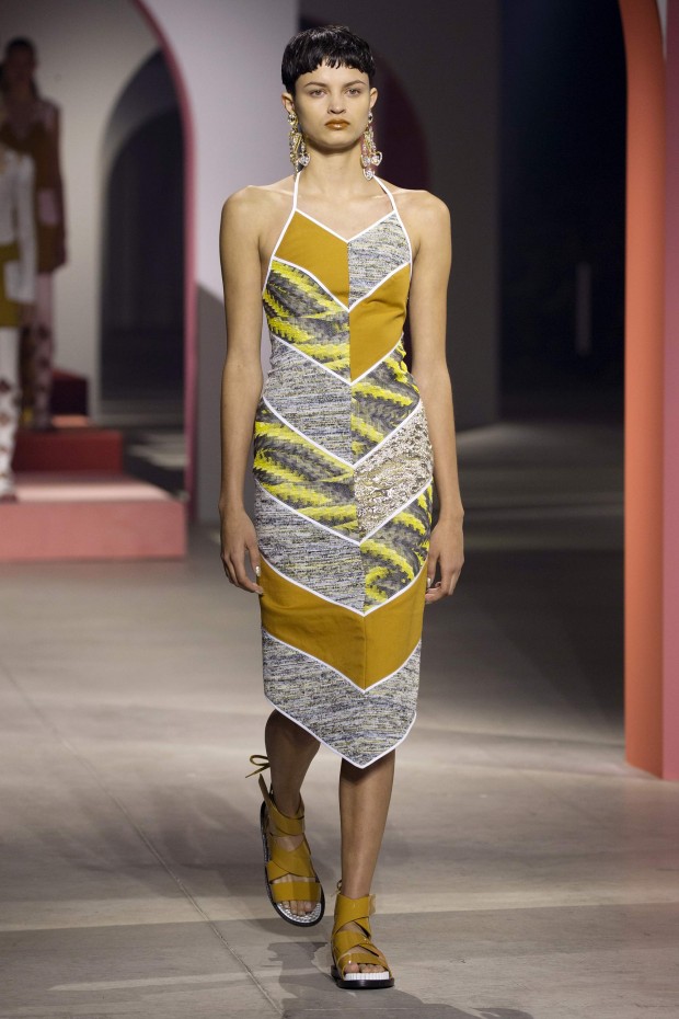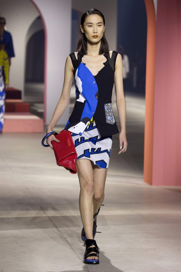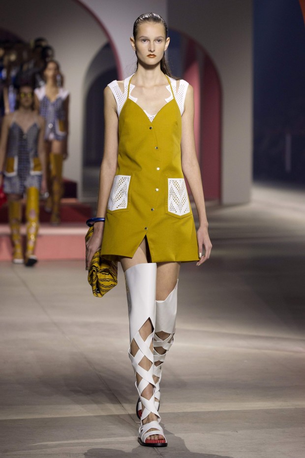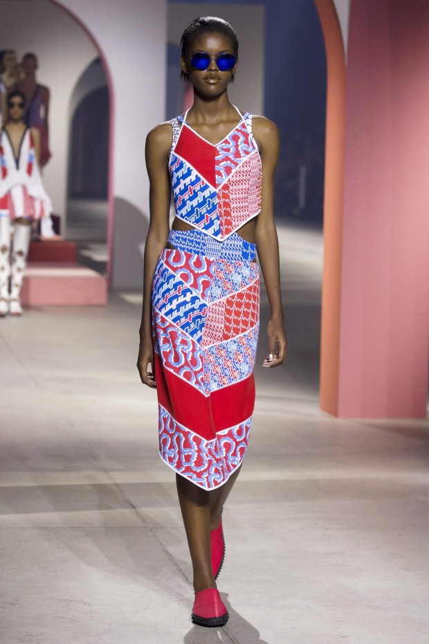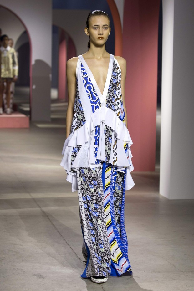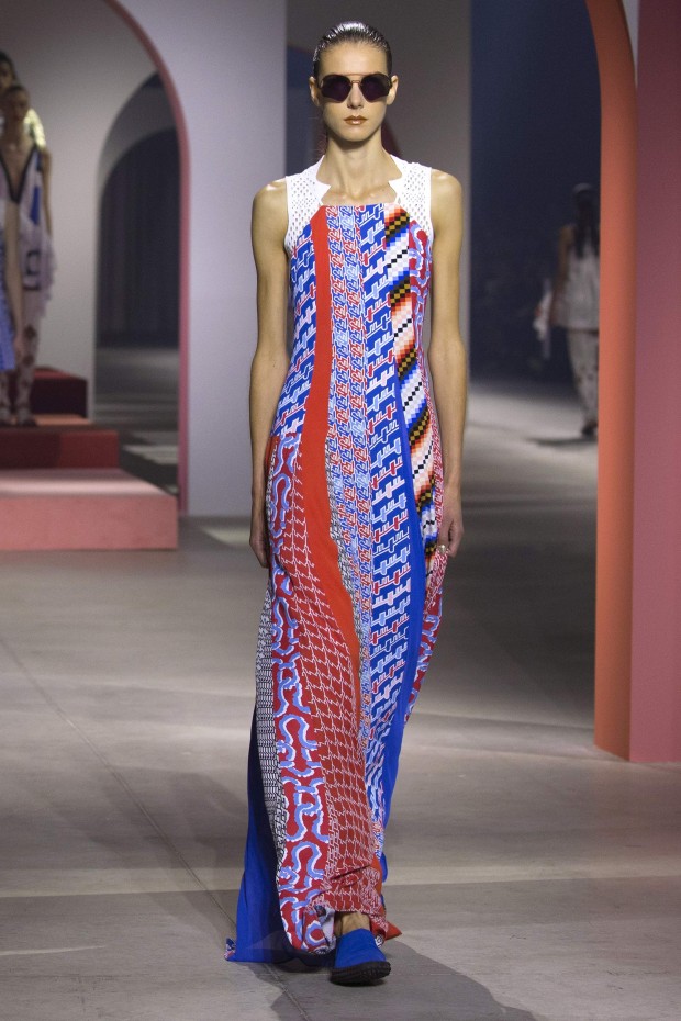 Показ начался с костюма, сшитого из лоскутов ткани, напоминающих песок, джунгли, мрамор и землю — настоящая карта местности какой-нибудь экзотической страны. Эта открытость новым местам и впечатлениям прослеживается во всей коллекции — от кружевных купальников и сарафанов с А-силуэтом поверх них, до удобных комбинезонов, коротких приталенных пальто и изобилия ярких психоделических принтов на тканях. Зигзаги, треугольники и прямоугольники, которые появлялись и на платьях, и на брюках, напоминали о внушительных размеров рюкзаках — неизменных спутниках настоящих путешественников.