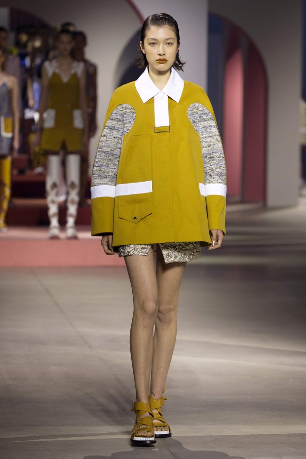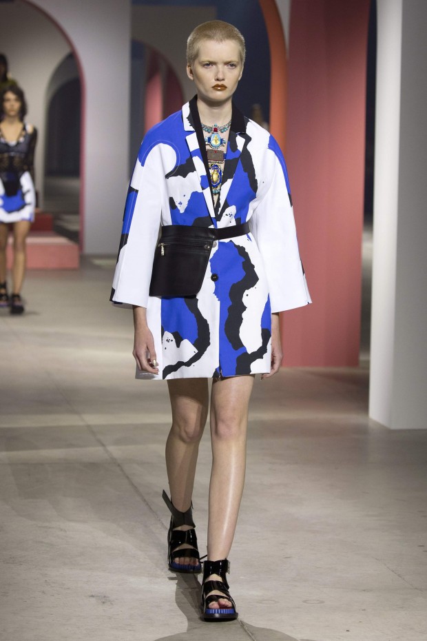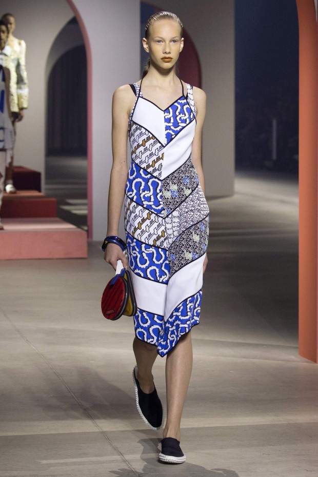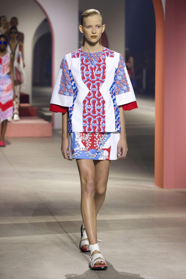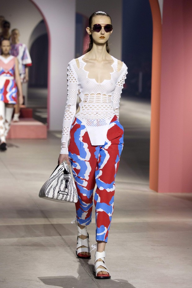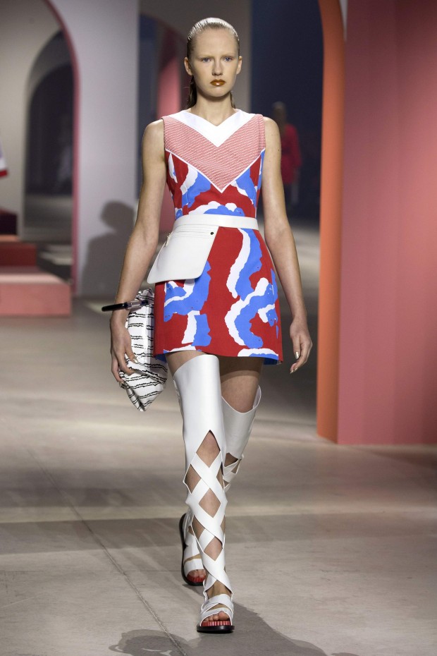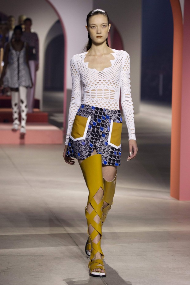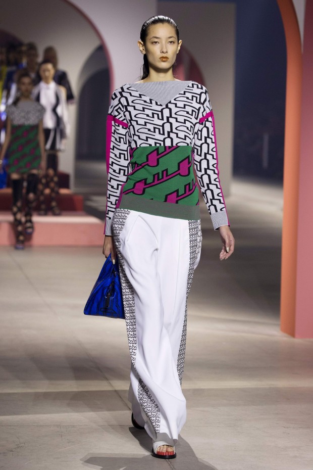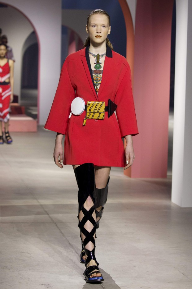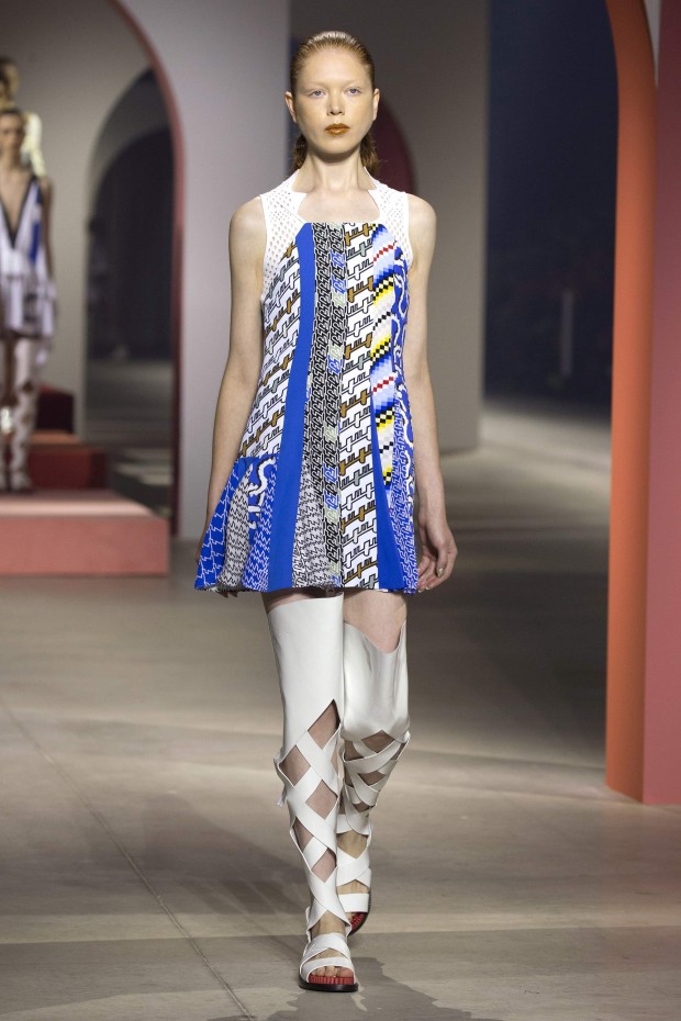 Показ начался с костюма, сшитого из лоскутов ткани, напоминающих песок, джунгли, мрамор и землю — настоящая карта местности какой-нибудь экзотической страны. Эта открытость новым местам и впечатлениям прослеживается во всей коллекции — от кружевных купальников и сарафанов с А-силуэтом поверх них, до удобных комбинезонов, коротких приталенных пальто и изобилия ярких психоделических принтов на тканях. Зигзаги, треугольники и прямоугольники, которые появлялись и на платьях, и на брюках, напоминали о внушительных размеров рюкзаках — неизменных спутниках настоящих путешественников.