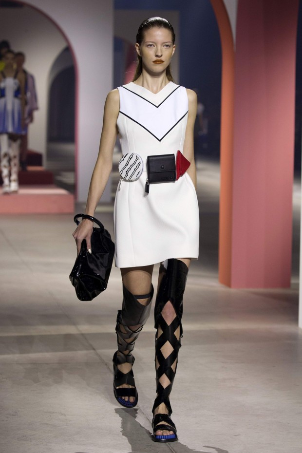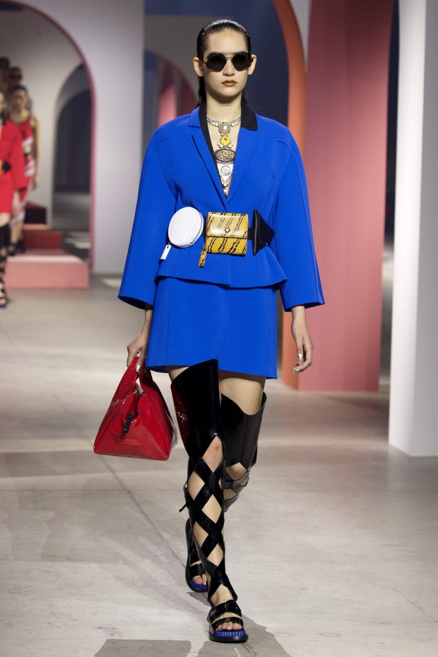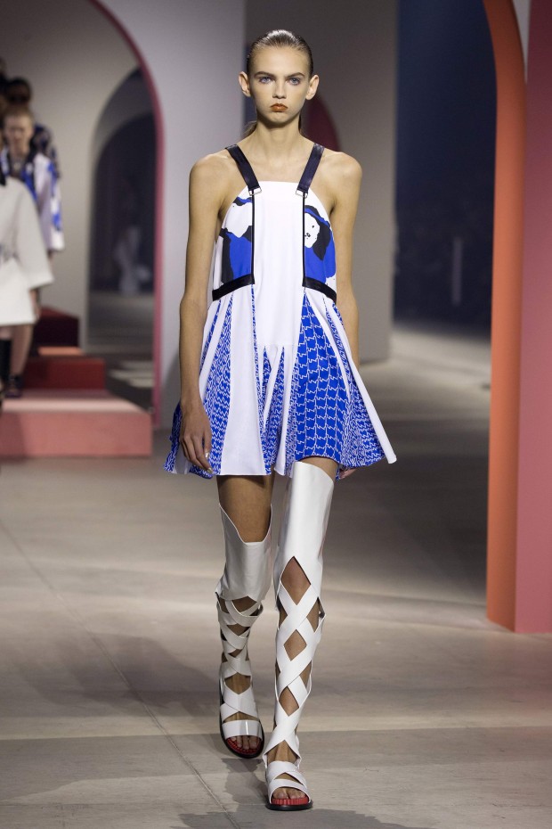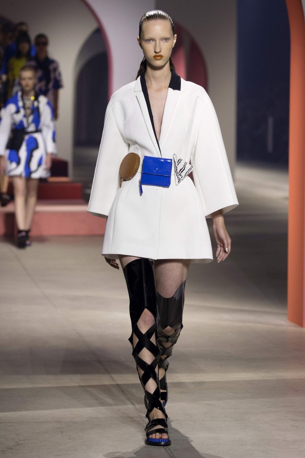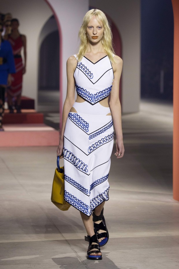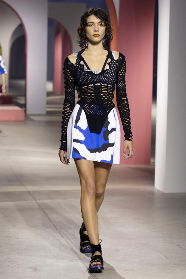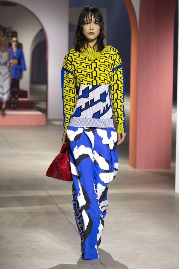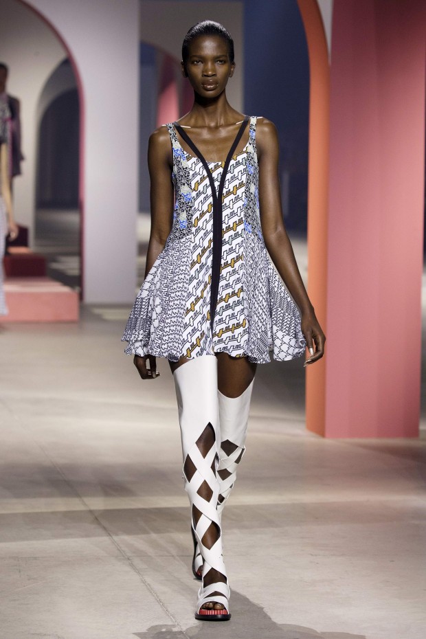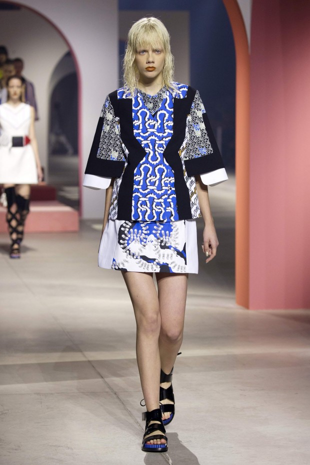 Показ начался с костюма, сшитого из лоскутов ткани, напоминающих песок, джунгли, мрамор и землю — настоящая карта местности какой-нибудь экзотической страны. Эта открытость новым местам и впечатлениям прослеживается во всей коллекции — от кружевных купальников и сарафанов с А-силуэтом поверх них, до удобных комбинезонов, коротких приталенных пальто и изобилия ярких психоделических принтов на тканях. Зигзаги, треугольники и прямоугольники, которые появлялись и на платьях, и на брюках, напоминали о внушительных размеров рюкзаках — неизменных спутниках настоящих путешественников.