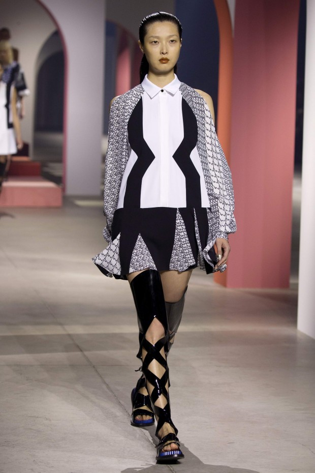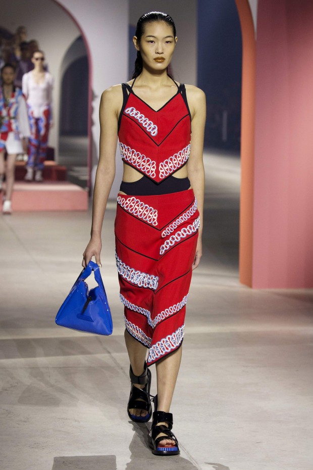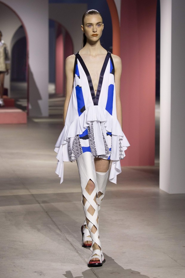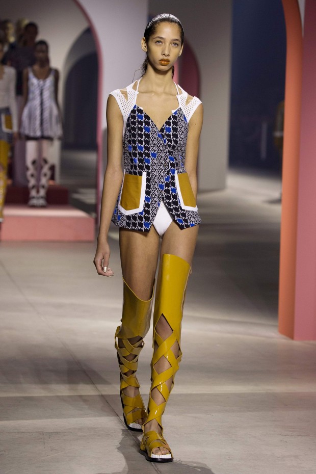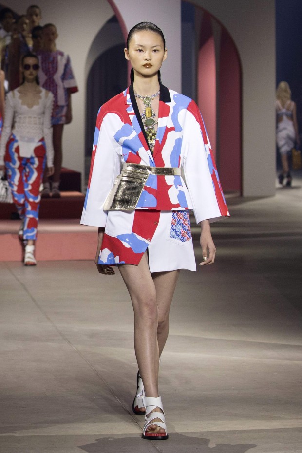 Огромные арки розового и персикового цветов украшали подиум, напоминая об архитектуре Древнего Рима и путешествиях, которые стали главной темой новой коллекции Kenzo. Графический пэчворк, купальники вместо нижнего белья и платья, в которых можно и на пляж, и на экскурсию, и в самолет — эта коллекция была насквозь пропитана настроением лета, которое никогда не заканчивается.