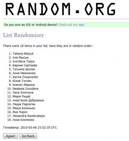 Итак, первой победительницей стала Татьяна Малюк (Tatiana Malyuk), которую мы выбрали случайным образом с помощью сервиса random.org среди всех правильно ответивших на специальный вопрос в фейсбуке и выполнивших все наши условия.