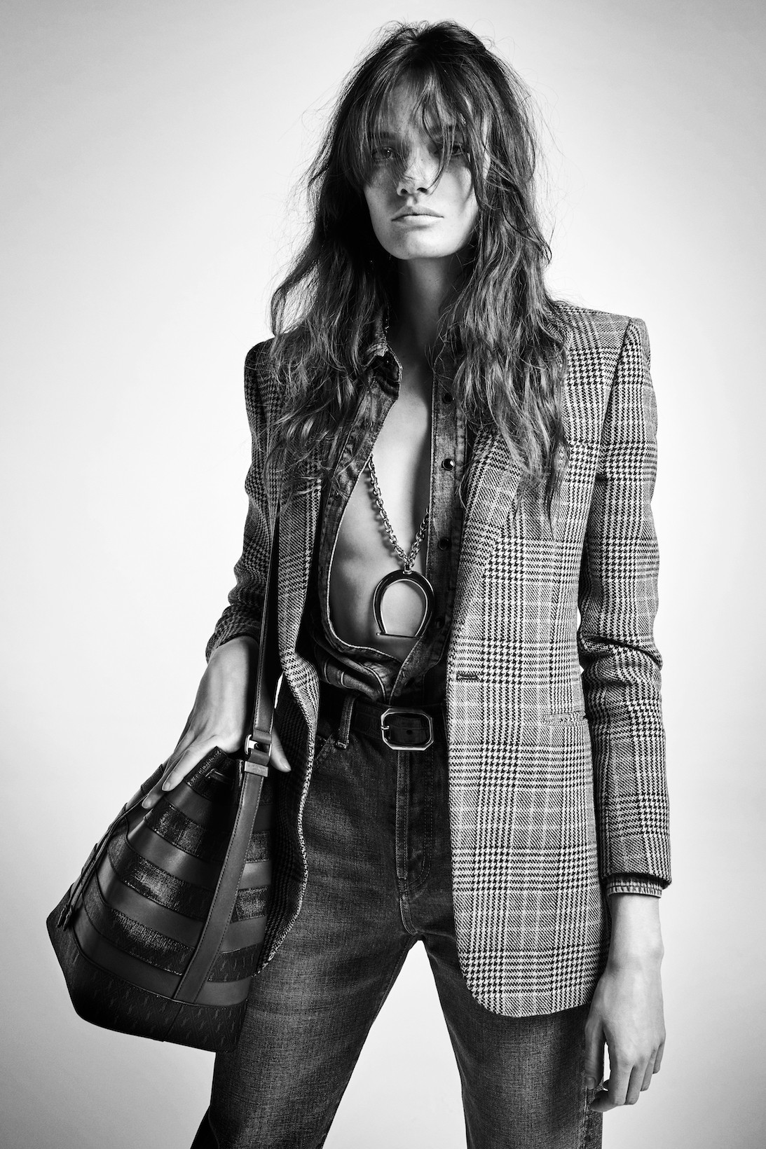 Вещи из коллекции напоминают образы рок-сцены 70-х. Среди ключевых моделей линейки – куртка Destroyed с карманами на клапанах из синего денима 70-х годов Trash Denim и однобортный твидовый пиджак. Также в этой коллекции представлены бюстгальтеры и трусики, украшенные сплошным узором в виде монограмм YSL со стразами.