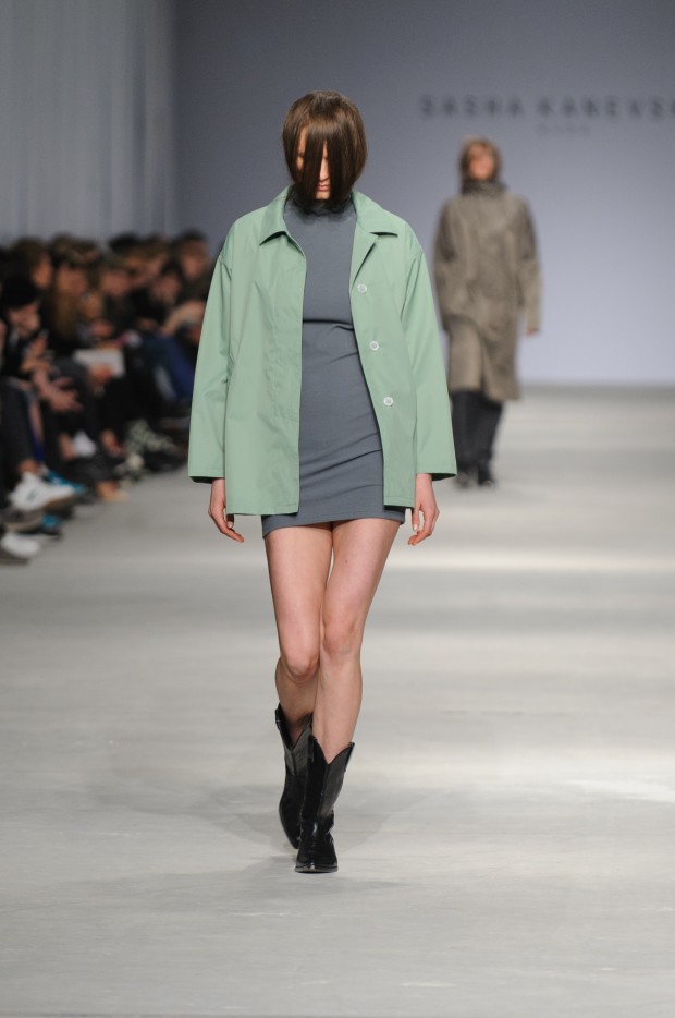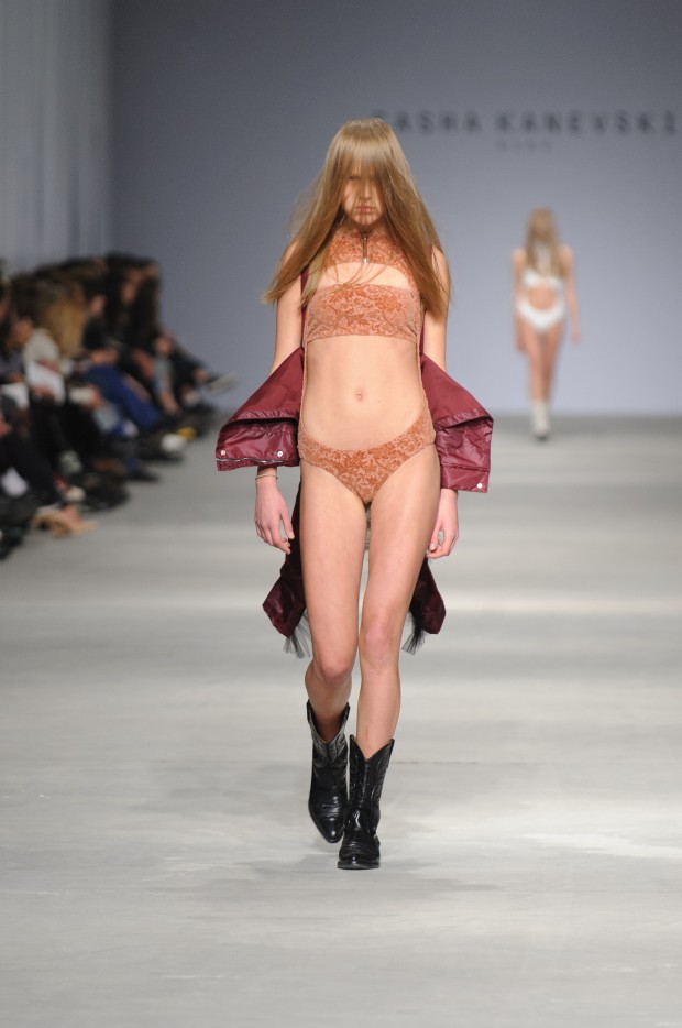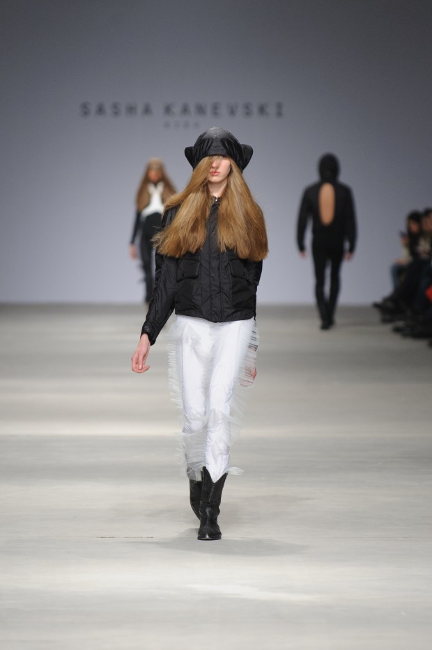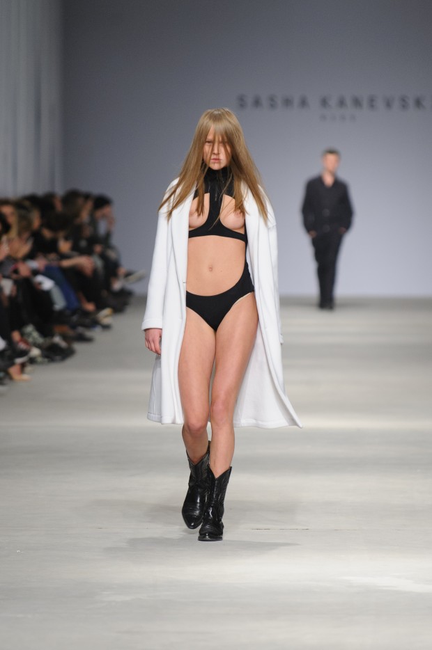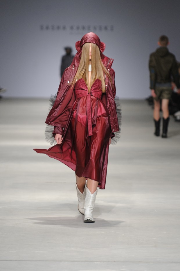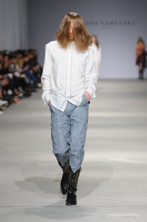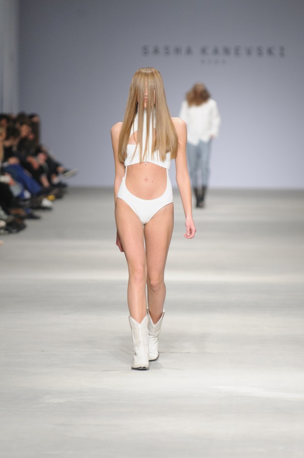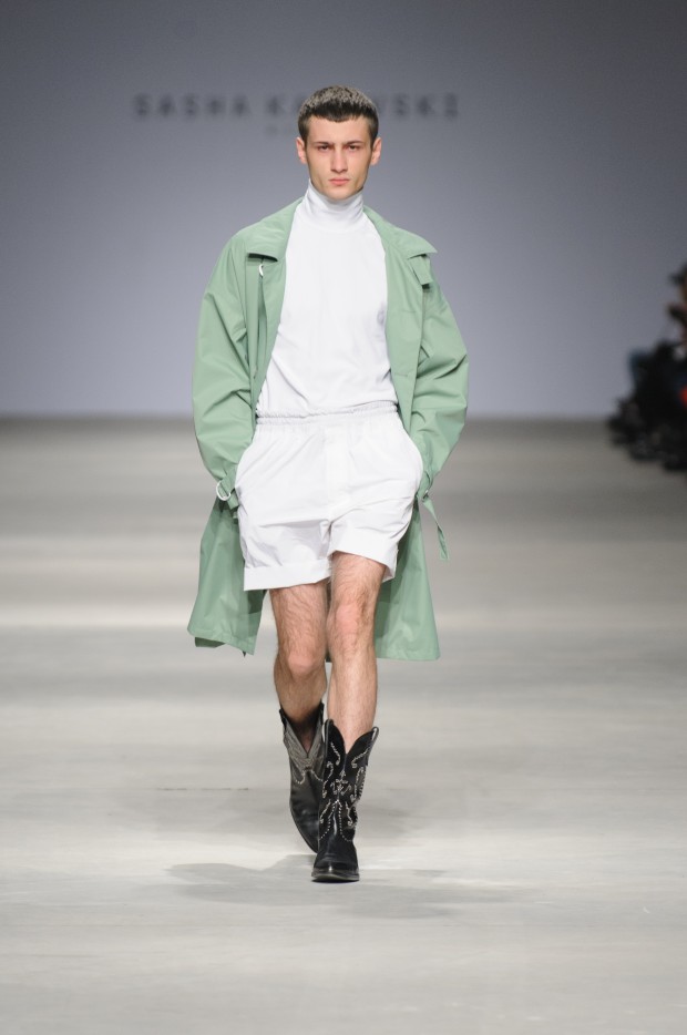 В субботу новую коллекцию представил sasha.kanevski. Если в прошлой коллекции дизайнер показывал футуристичных клаберов, то сейчас его фантазию захватили урбанистические варвары, нарушающие все правила составления образов. Комбинезоны из жаккарда, парки из плащевки, купальники и ковбойские сапоги, — все смешалось в ансамблях, которые мы увидели на подиуме.