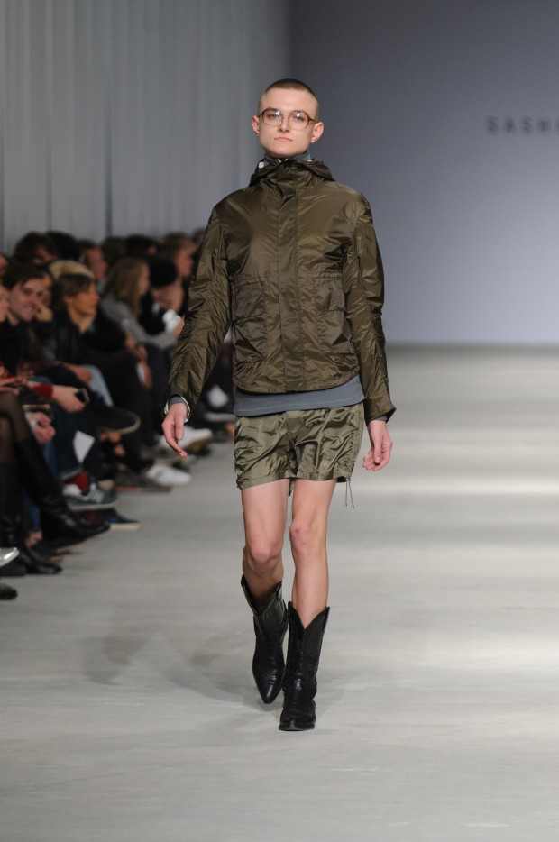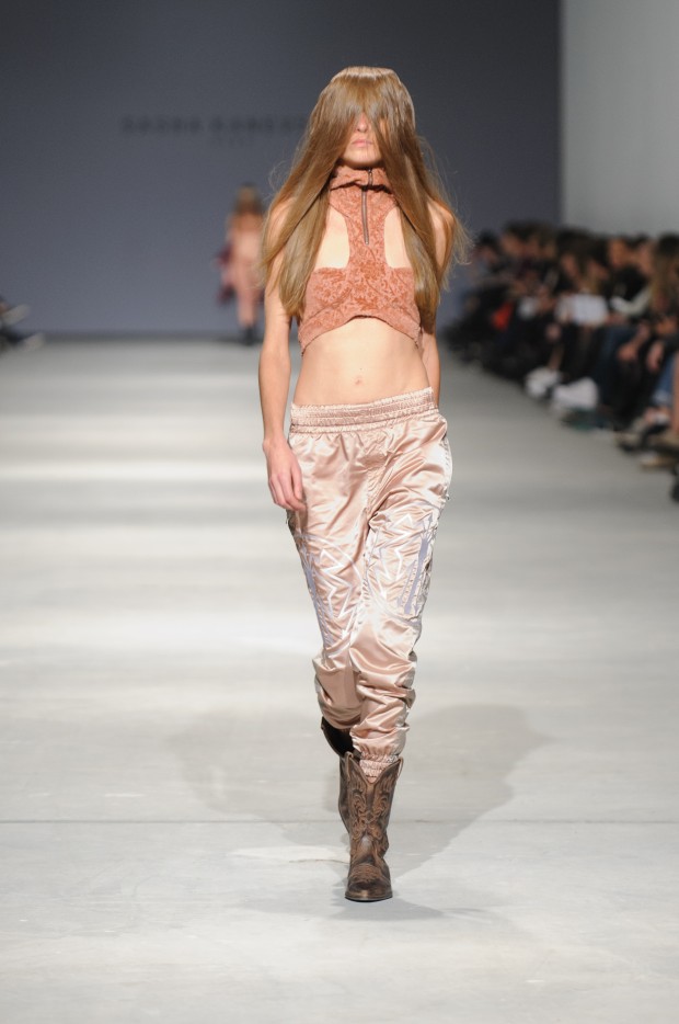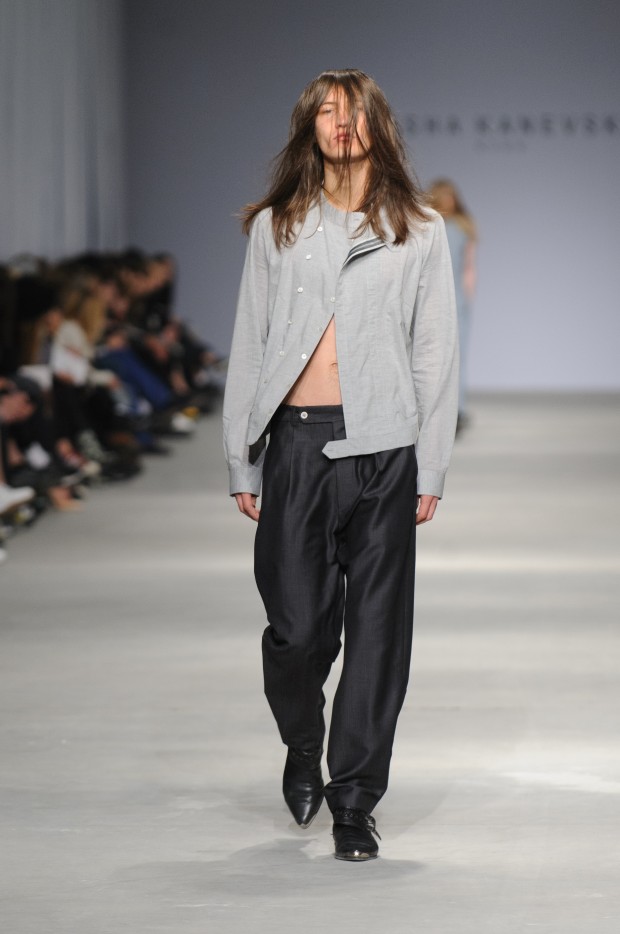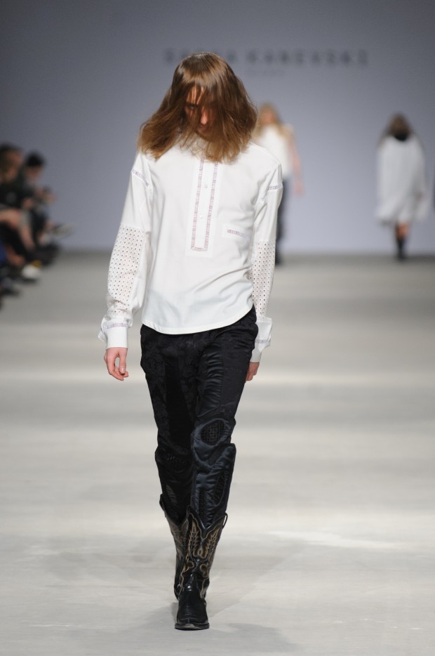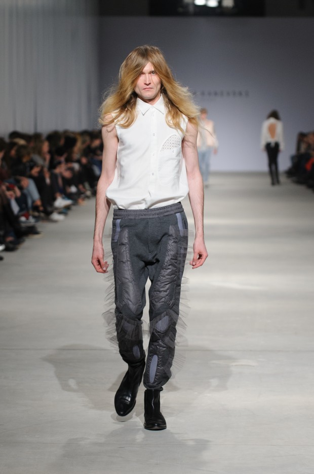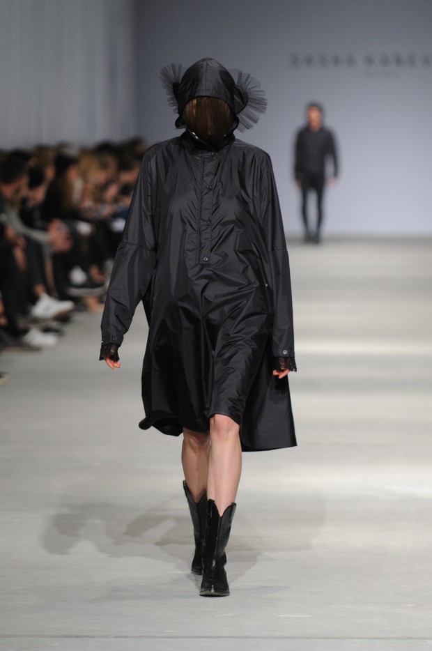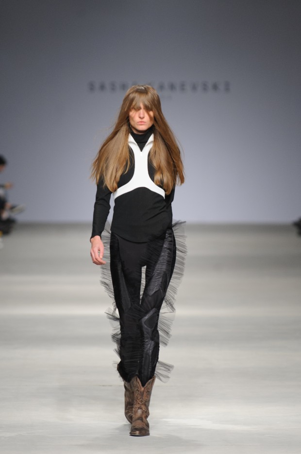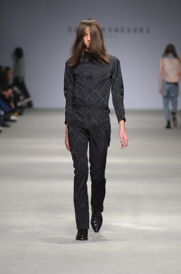 В субботу новую коллекцию представил sasha.kanevski. Если в прошлой коллекции дизайнер показывал футуристичных клаберов, то сейчас его фантазию захватили урбанистические варвары, нарушающие все правила составления образов. Комбинезоны из жаккарда, парки из плащевки, купальники и ковбойские сапоги, — все смешалось в ансамблях, которые мы увидели на подиуме.