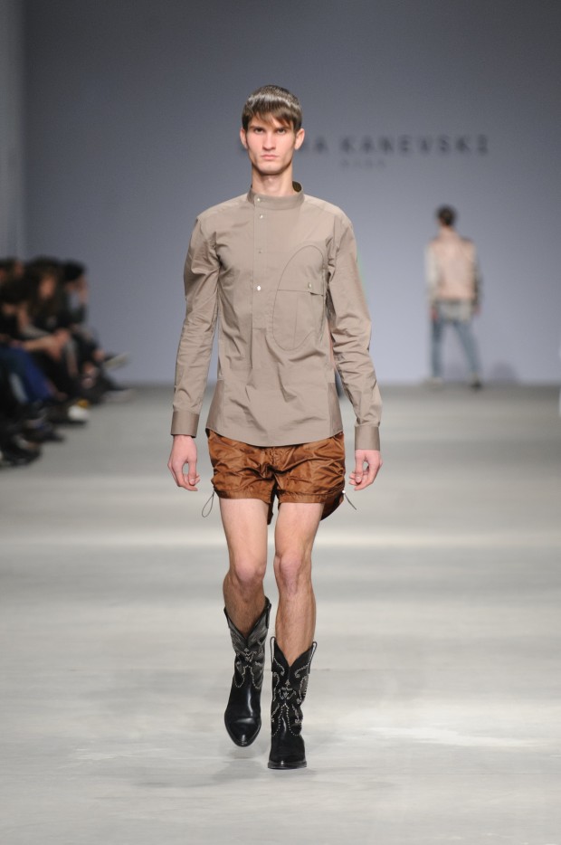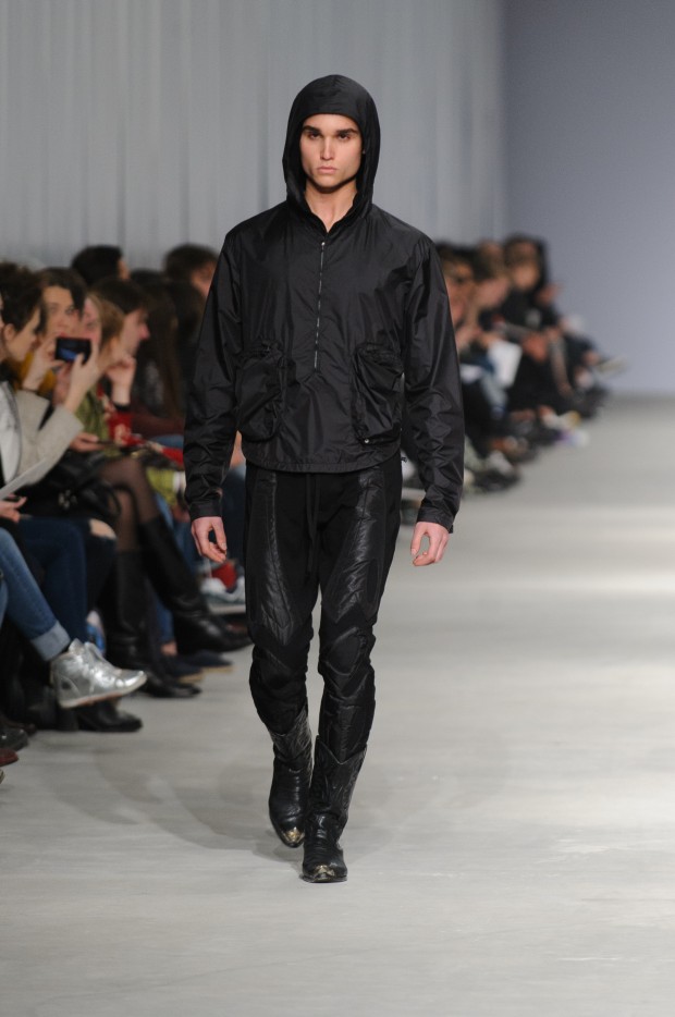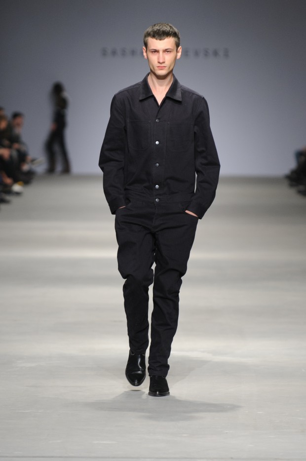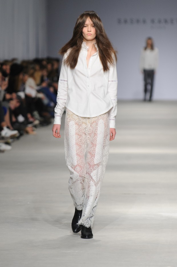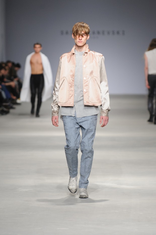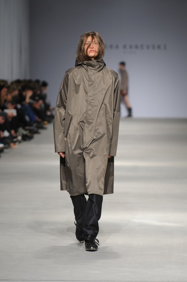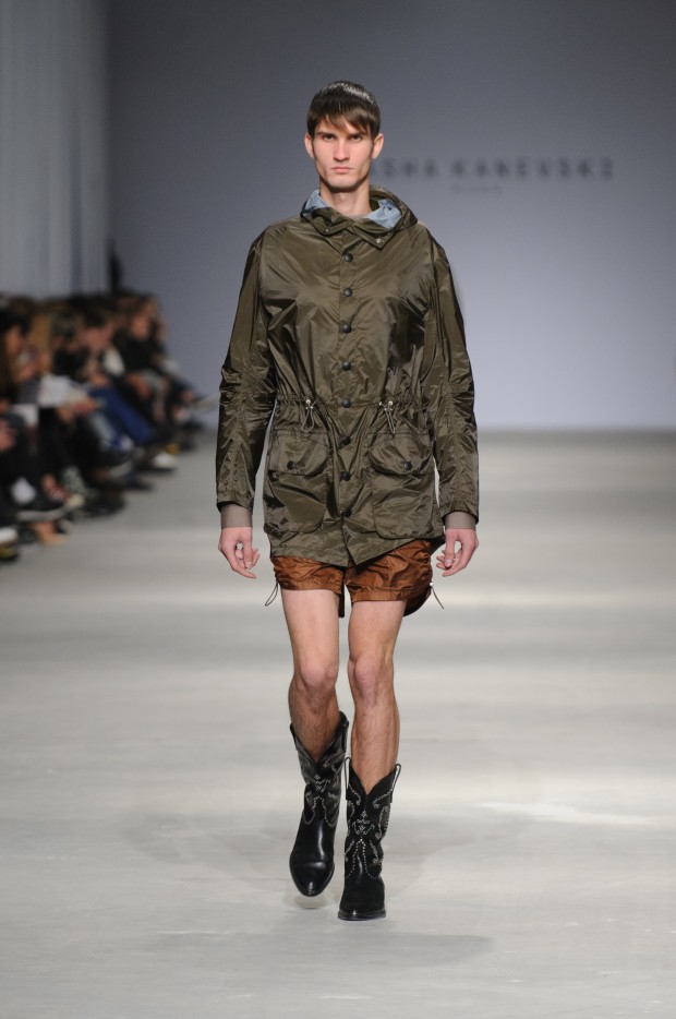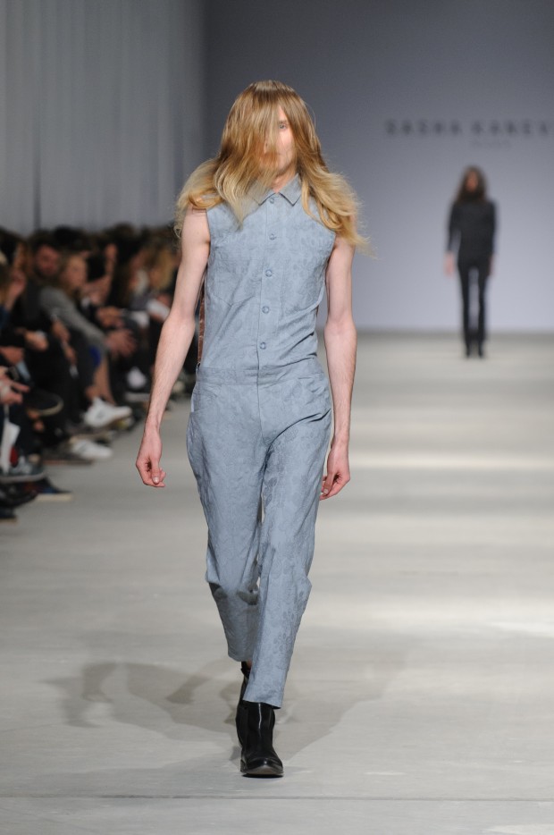 В субботу новую коллекцию представил sasha.kanevski. Если в прошлой коллекции дизайнер показывал футуристичных клаберов, то сейчас его фантазию захватили урбанистические варвары, нарушающие все правила составления образов. Комбинезоны из жаккарда, парки из плащевки, купальники и ковбойские сапоги, — все смешалось в ансамблях, которые мы увидели на подиуме.
