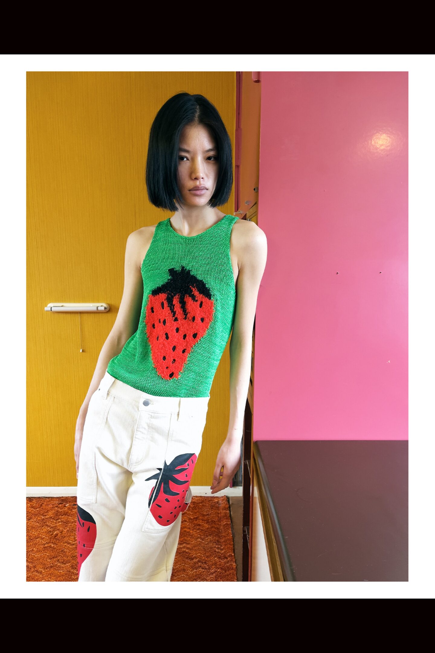 Вещи, которые украшает крупный принт клубника – наиболее запоминающиеся в этой коллекции! Ягода также украшает и шлепанцы из коллекции, альтернативой которым представлены более сдержанные по дизайну шлепки-резинки, а также фирменные лоферы с цепочкой и недавно выпущенные кроссовки бренда.