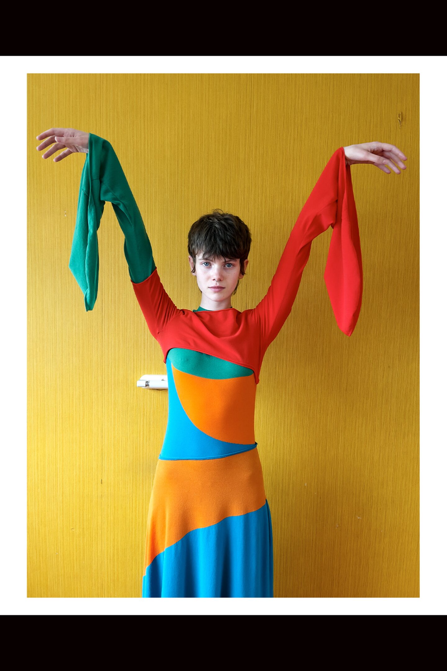 Героиня коллекции JW Anderson Resort 2022 – юная тусовщица-протагонистка, которая носит укороченные блейзеры, игривые платья в диагональную разноцветную полоску, яркие блузы, бермуды и слаксы.
