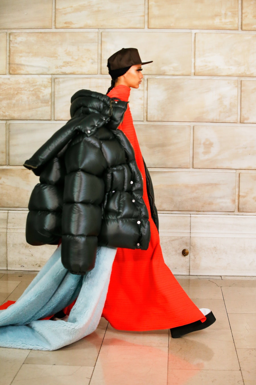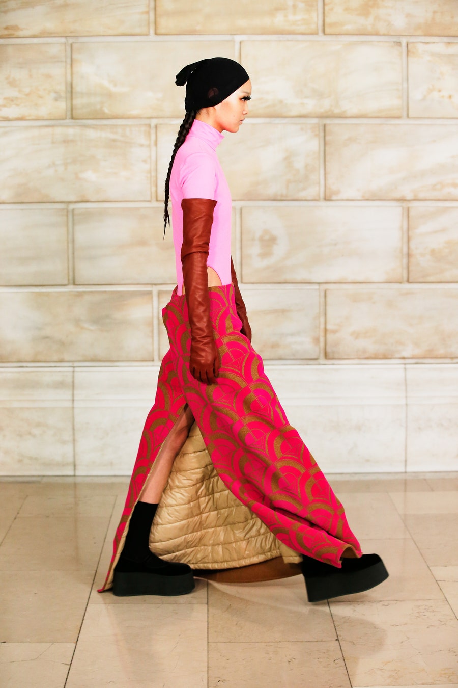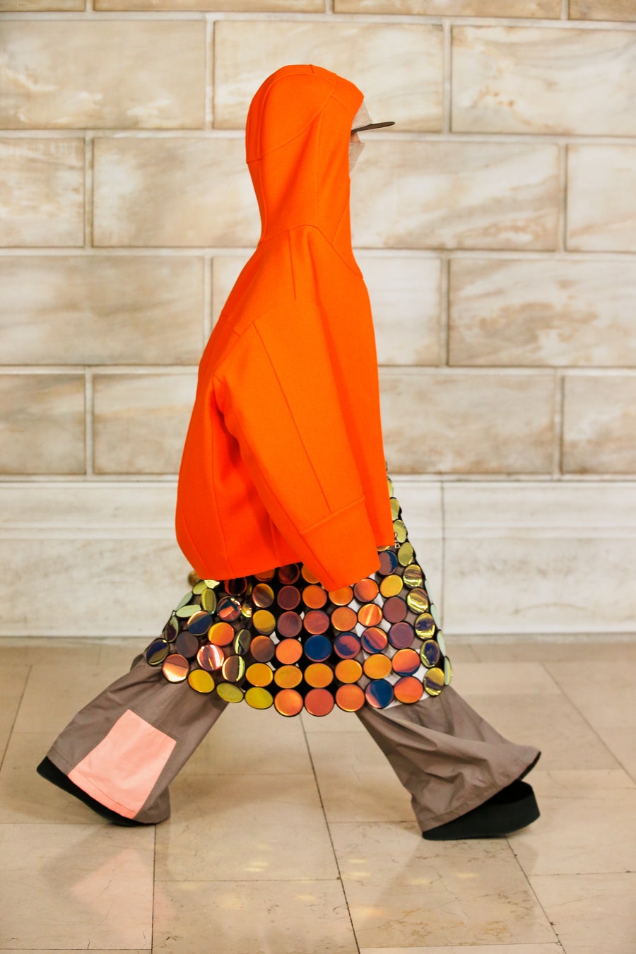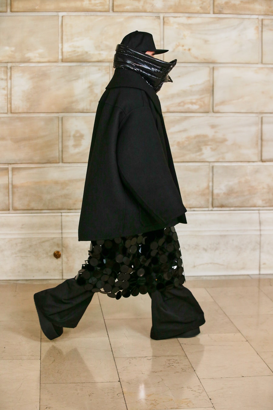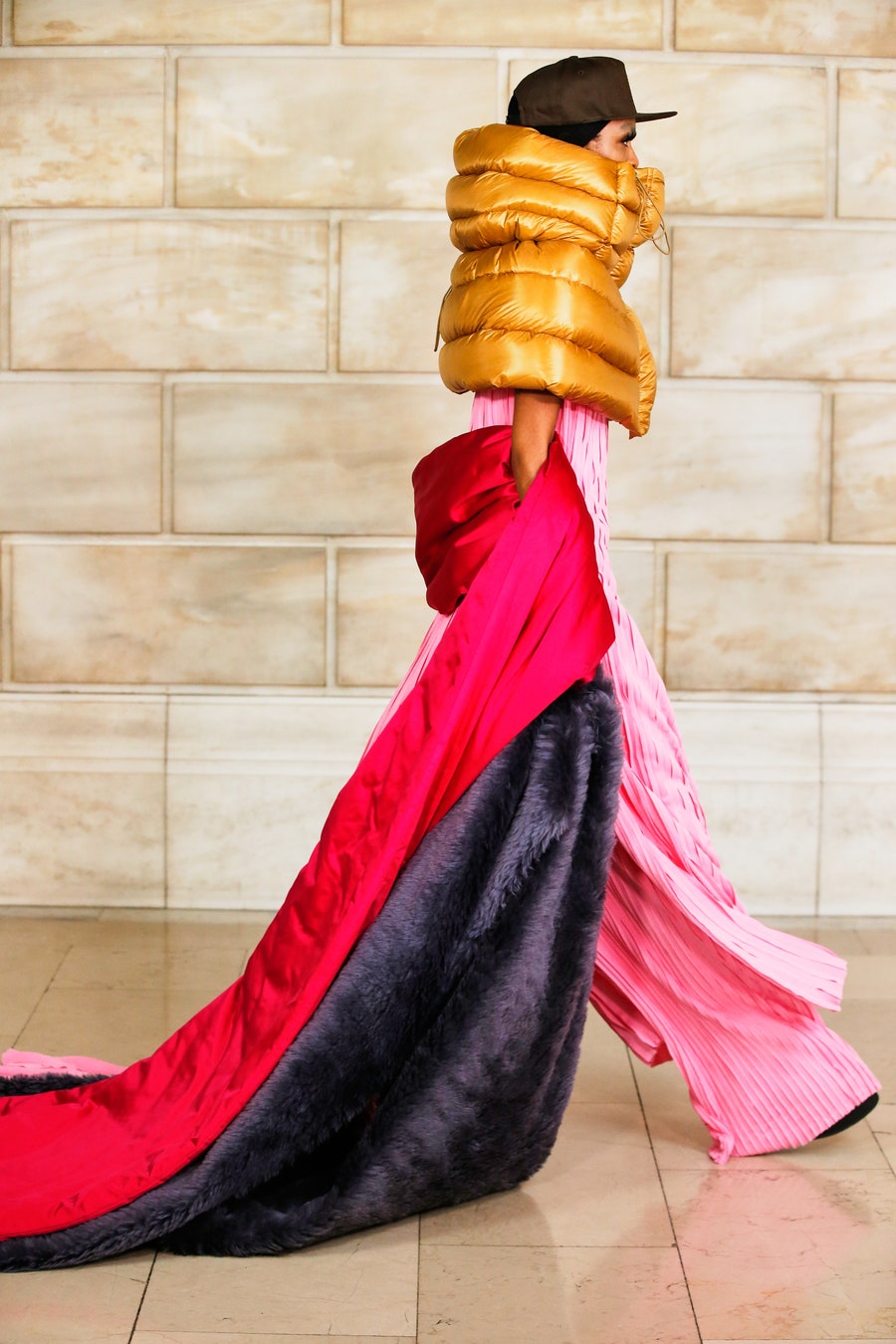 Платья на брюки; спортивные бомберы, декорироанные кольчугой на платья-кольчуги; дутые и классические пальто поверх; балаклавы, а на них кепки или bucket hats. А также: свитера, лыжные штаны, длинные перчатки и платья со шлейфами, юбки миди и боди с вырезами по бокам, дутые шарфы-снуды, леггинсы, самая крутая обувь сезона на платформе. И все это в миксе абсолютно сумасшедших текстур (лак, искусственный мех, дутые вещи), принтов и расцветок.
