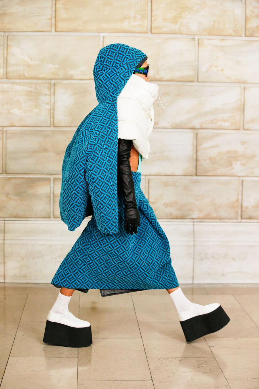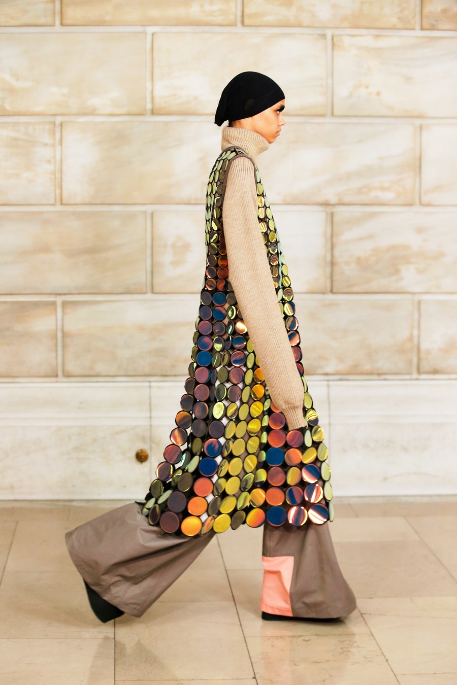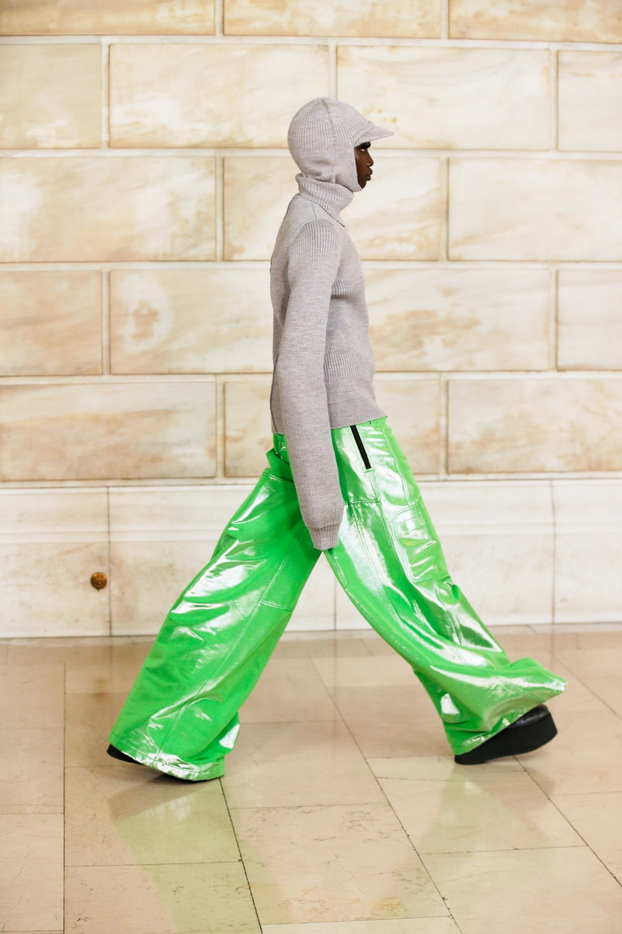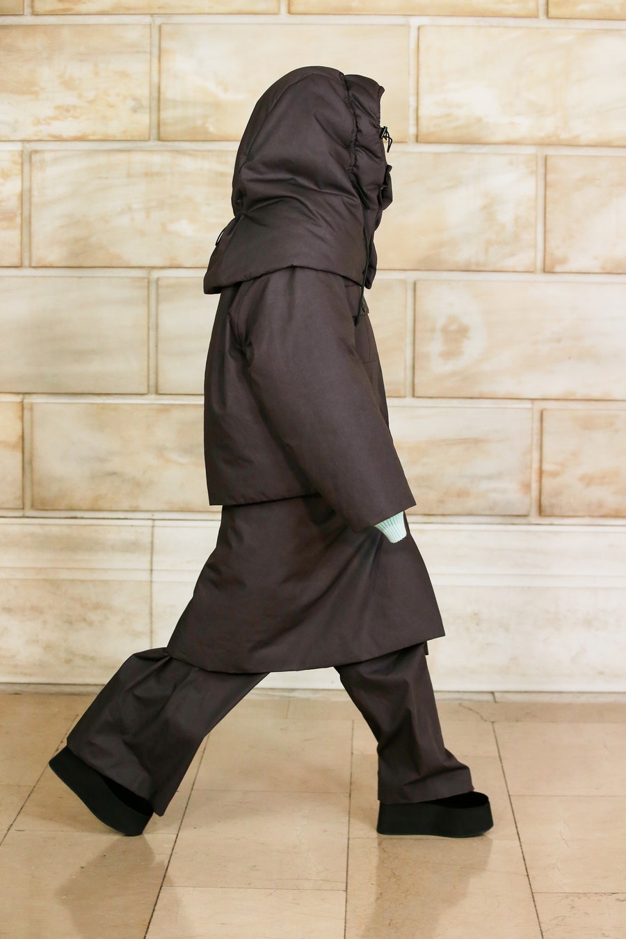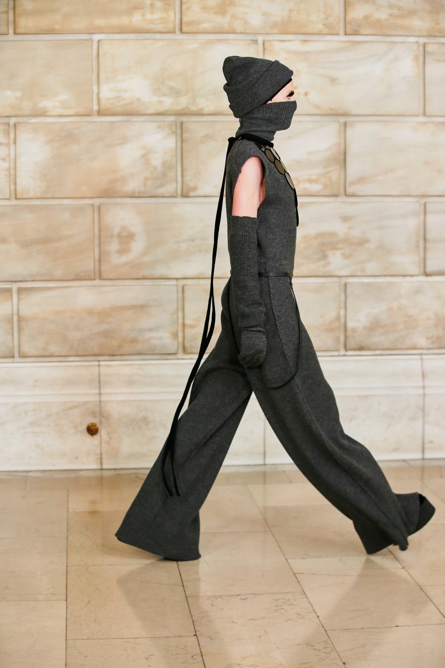 Платья на брюки; спортивные бомберы, декорироанные кольчугой на платья-кольчуги; дутые и классические пальто поверх; балаклавы, а на них кепки или bucket hats. А также: свитера, лыжные штаны, длинные перчатки и платья со шлейфами, юбки миди и боди с вырезами по бокам, дутые шарфы-снуды, леггинсы, самая крутая обувь сезона на платформе. И все это в миксе абсолютно сумасшедших текстур (лак, искусственный мех, дутые вещи), принтов и расцветок.