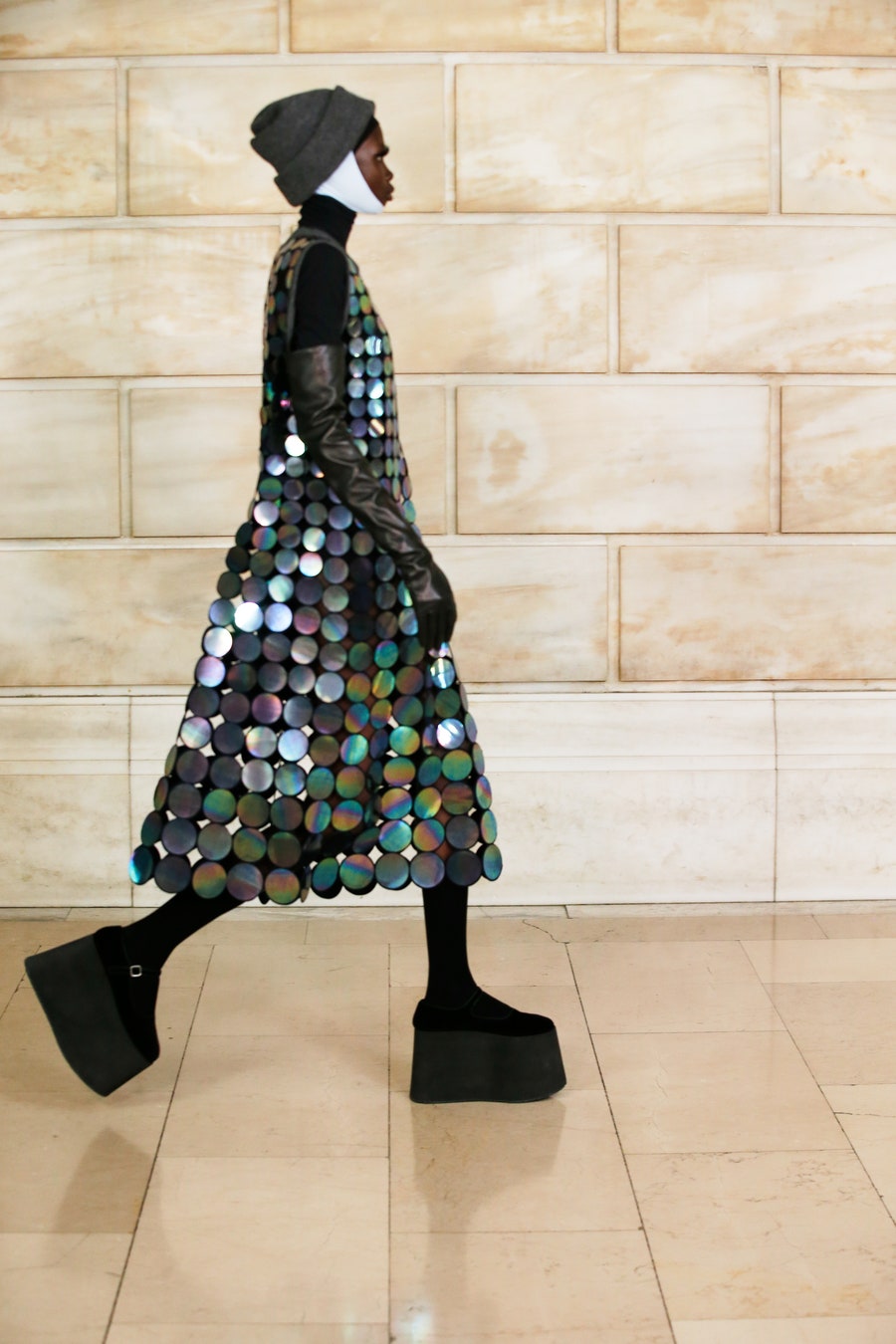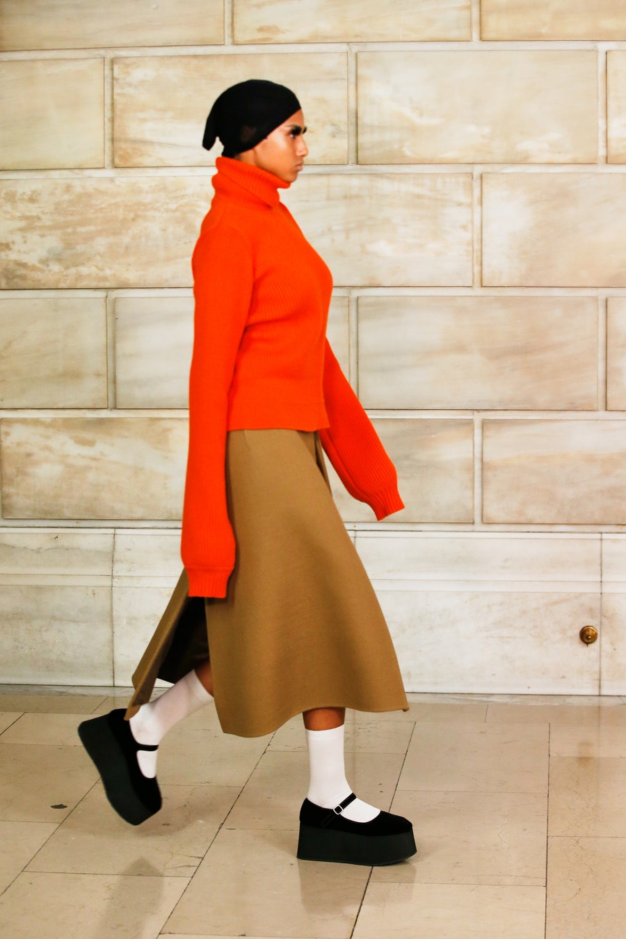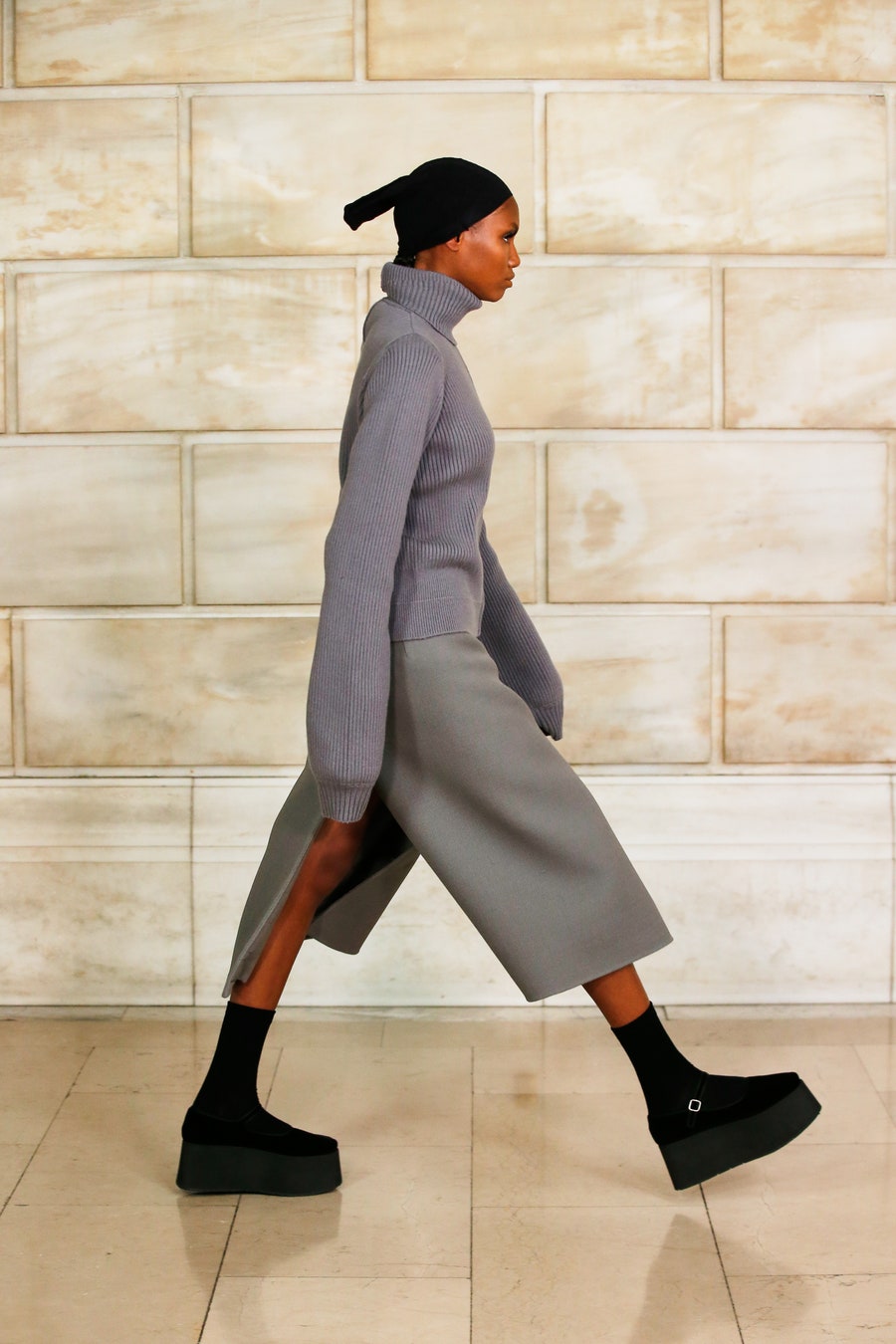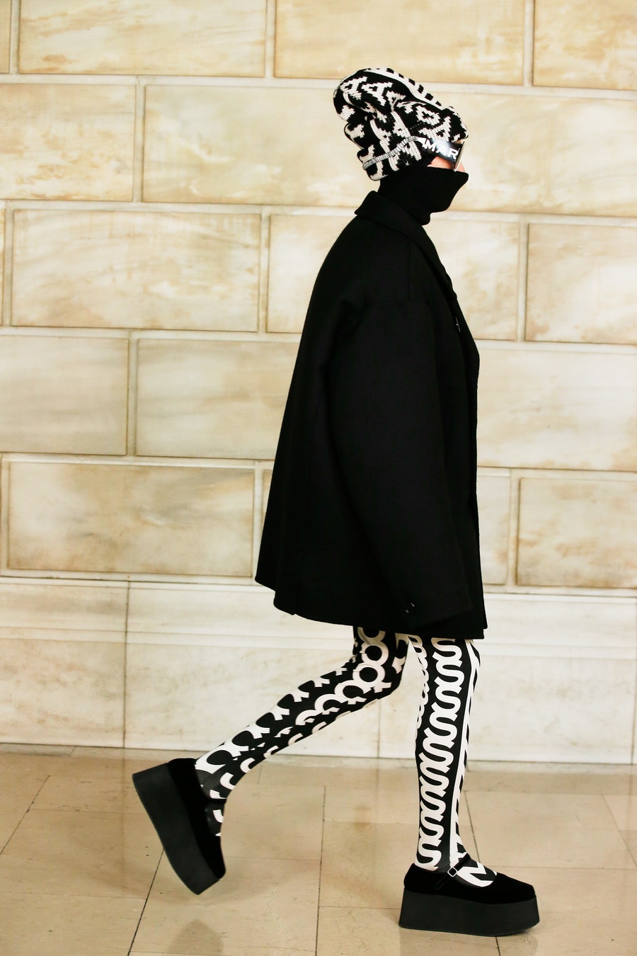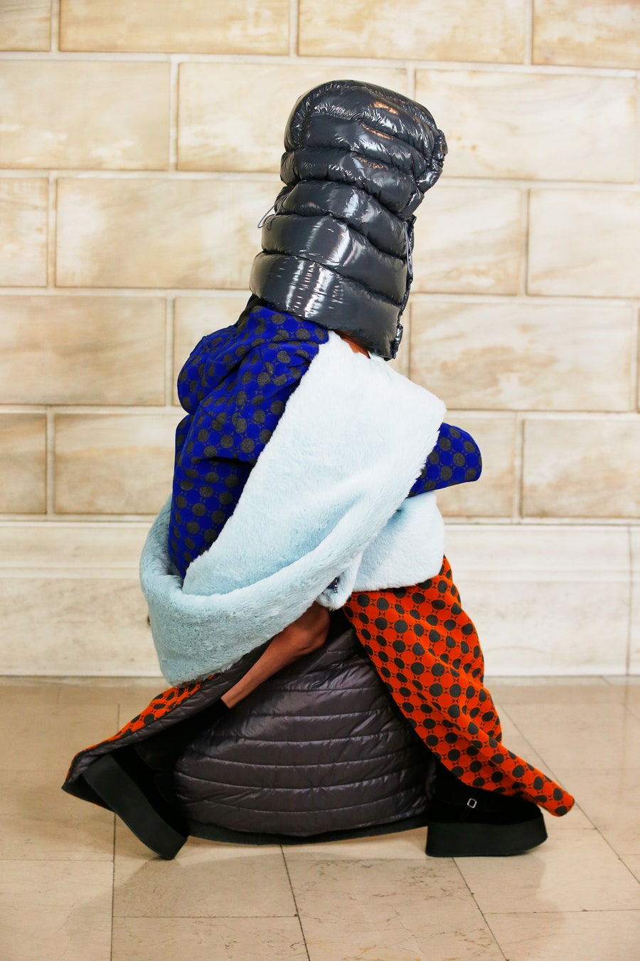Платья на брюки; спортивные бомберы, декорироанные кольчугой на платья-кольчуги; дутые и классические пальто поверх; балаклавы, а на них кепки или bucket hats. А также: свитера, лыжные штаны, длинные перчатки и платья со шлейфами, юбки миди и боди с вырезами по бокам, дутые шарфы-снуды, леггинсы, самая крутая обувь сезона на платформе. И все это в миксе абсолютно сумасшедших текстур (лак, искусственный мех, дутые вещи), принтов и расцветок.