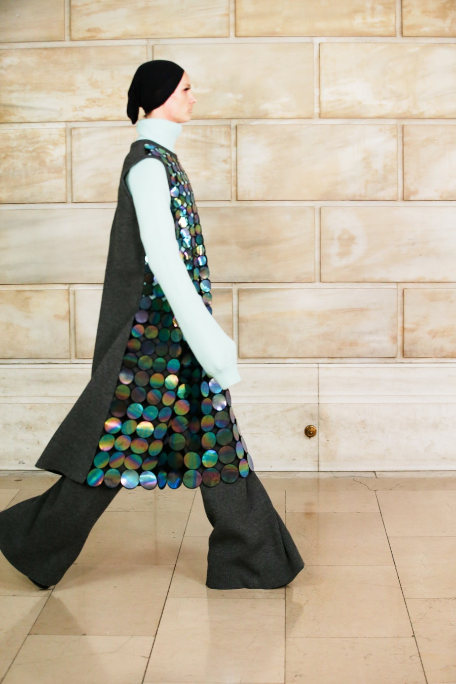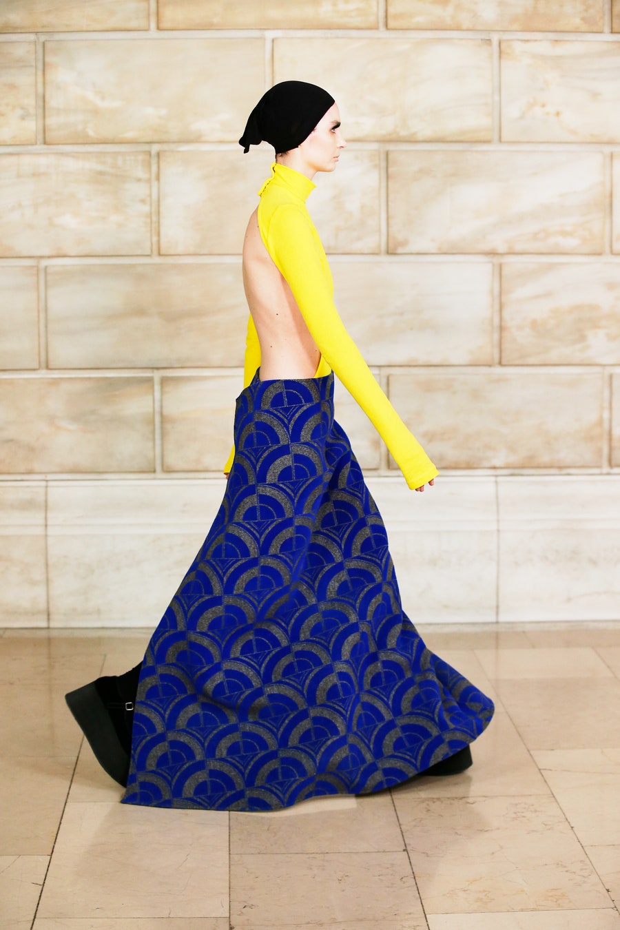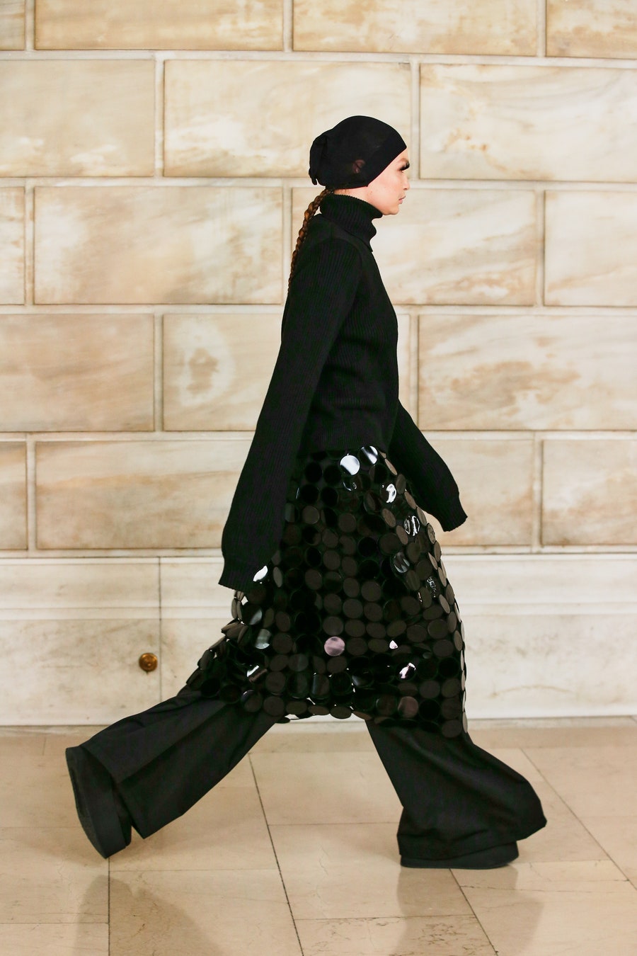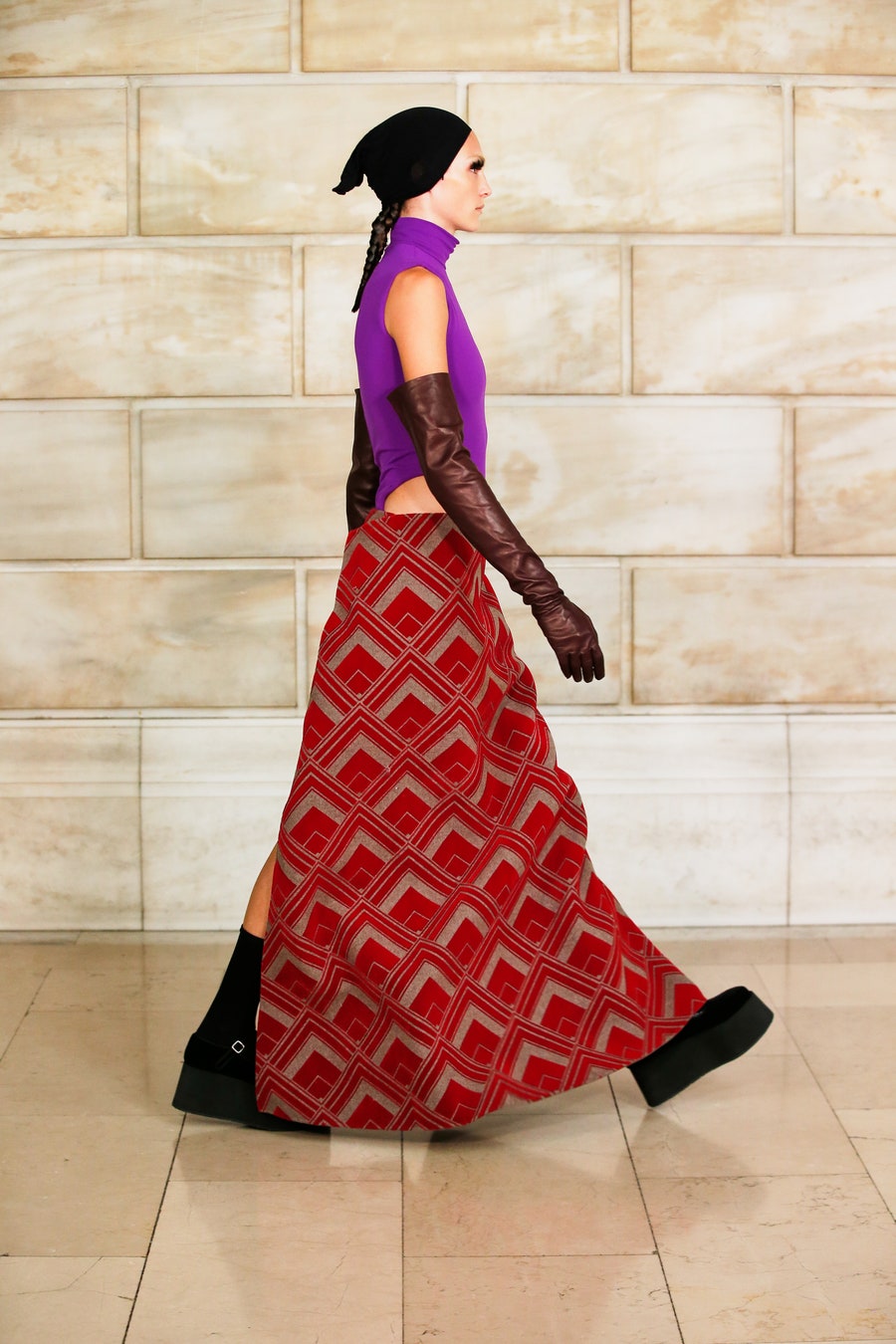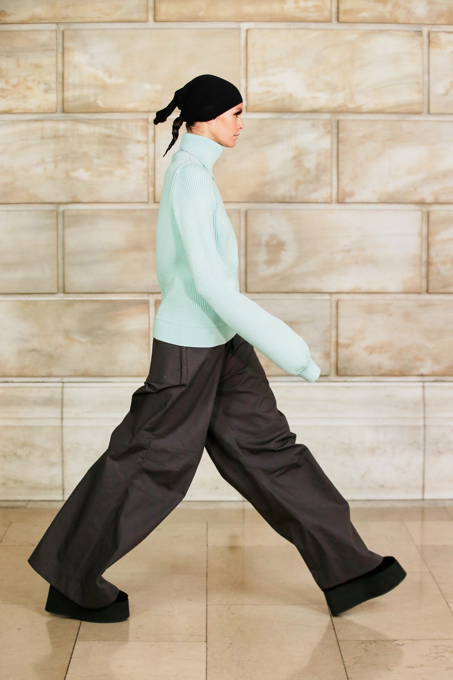 Платья на брюки; спортивные бомберы, декорироанные кольчугой на платья-кольчуги; дутые и классические пальто поверх; балаклавы, а на них кепки или bucket hats. А также: свитера, лыжные штаны, длинные перчатки и платья со шлейфами, юбки миди и боди с вырезами по бокам, дутые шарфы-снуды, леггинсы, самая крутая обувь сезона на платформе. И все это в миксе абсолютно сумасшедших текстур (лак, искусственный мех, дутые вещи), принтов и расцветок.