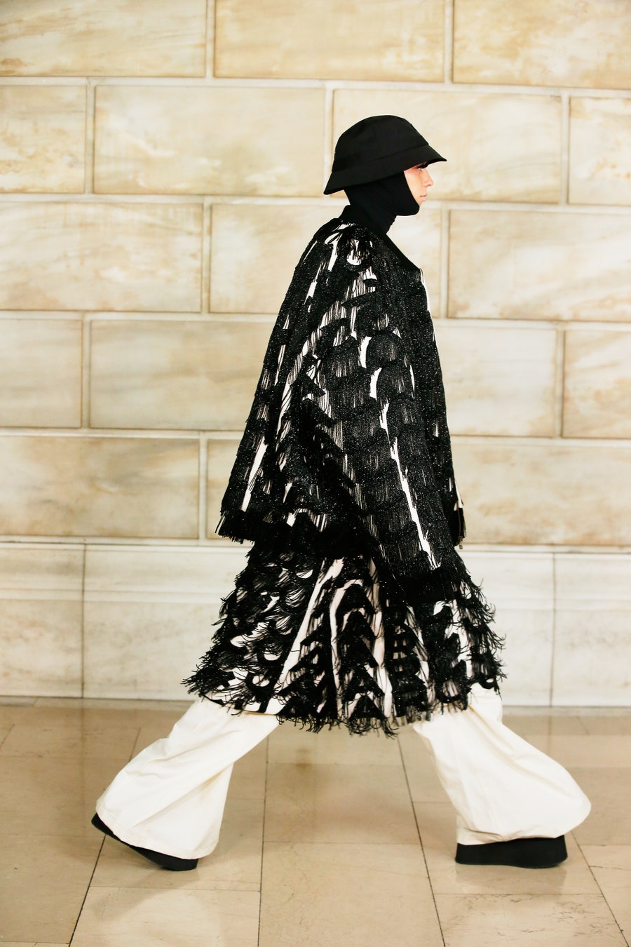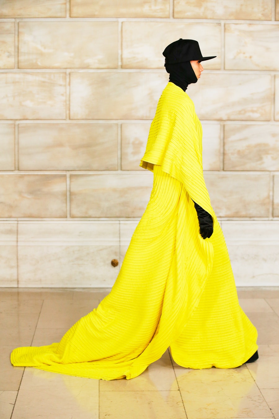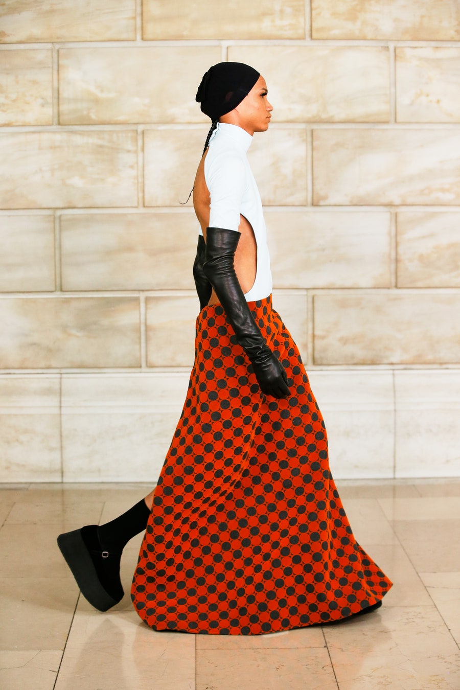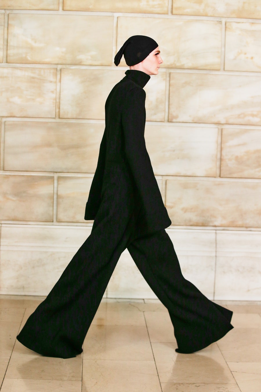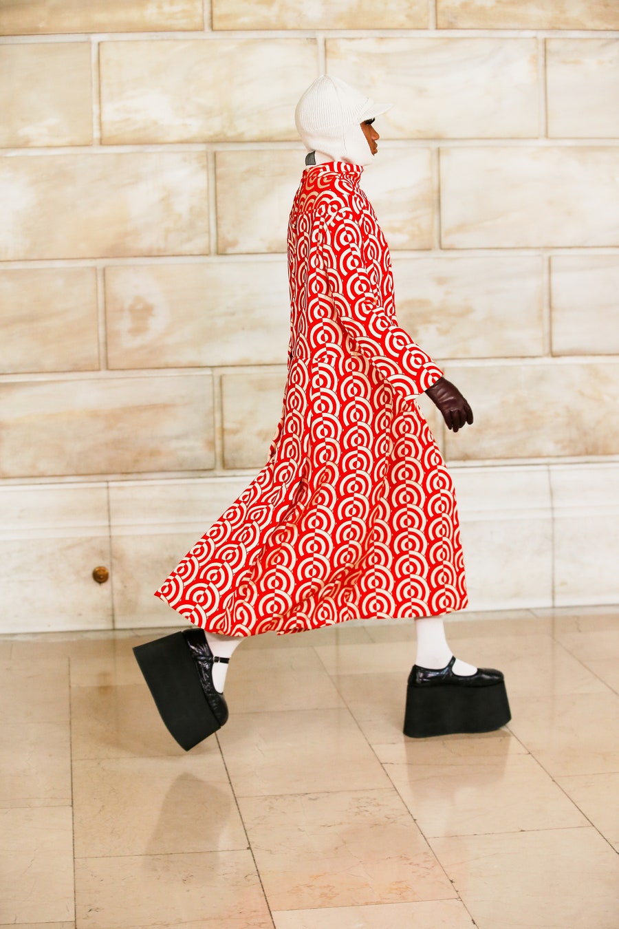 Платья на брюки; спортивные бомберы, декорироанные кольчугой на платья-кольчуги; дутые и классические пальто поверх; балаклавы, а на них кепки или bucket hats. А также: свитера, лыжные штаны, длинные перчатки и платья со шлейфами, юбки миди и боди с вырезами по бокам, дутые шарфы-снуды, леггинсы, самая крутая обувь сезона на платформе. И все это в миксе абсолютно сумасшедших текстур (лак, искусственный мех, дутые вещи), принтов и расцветок.