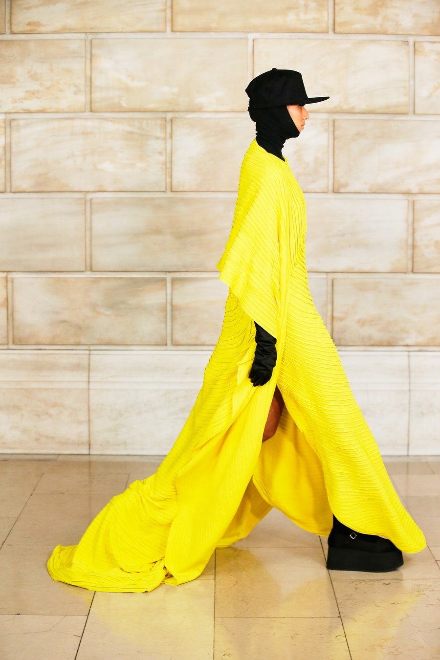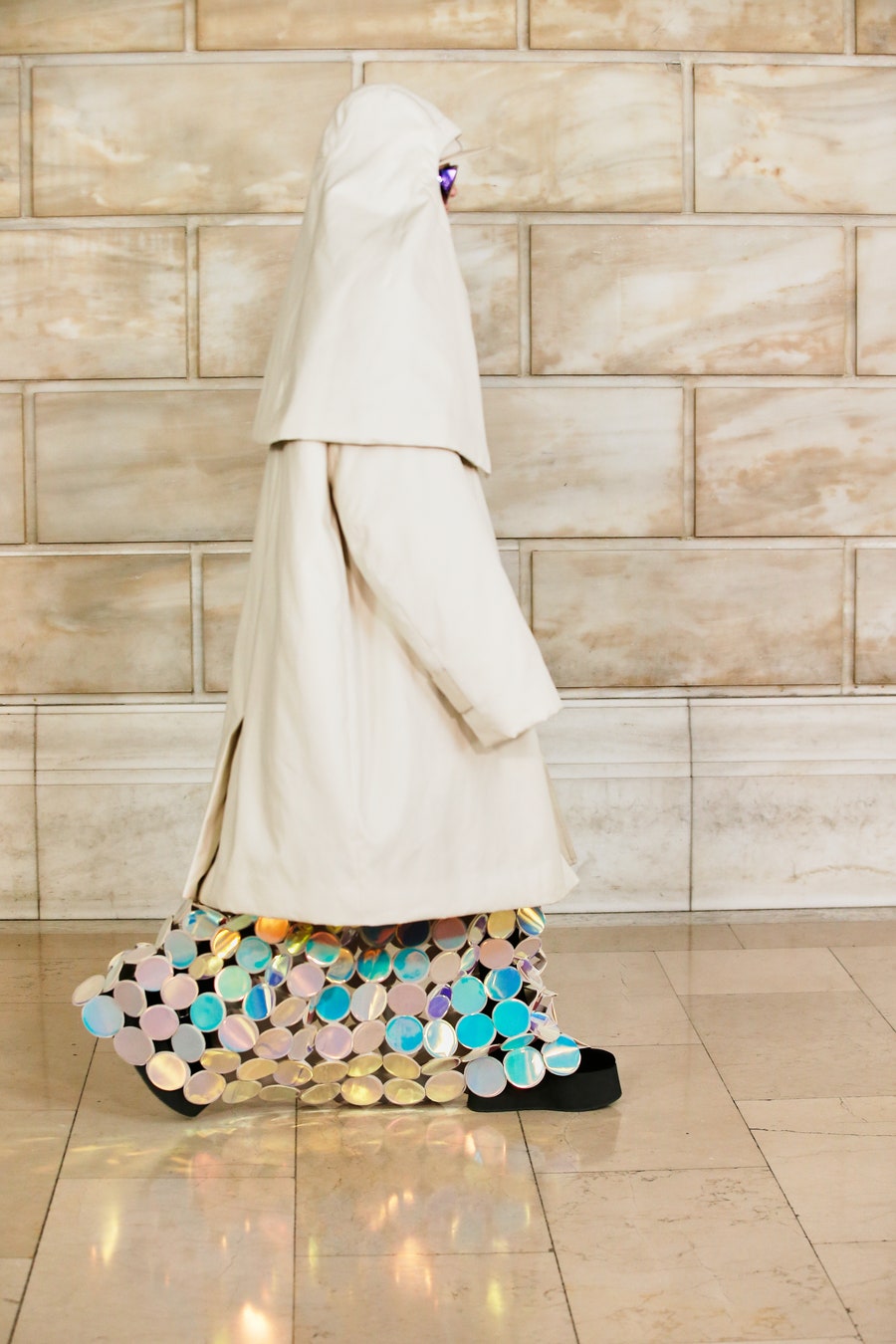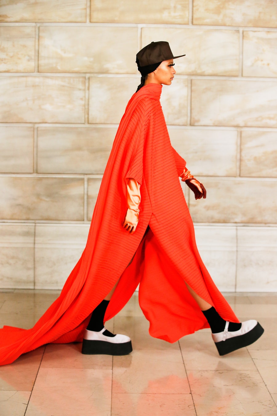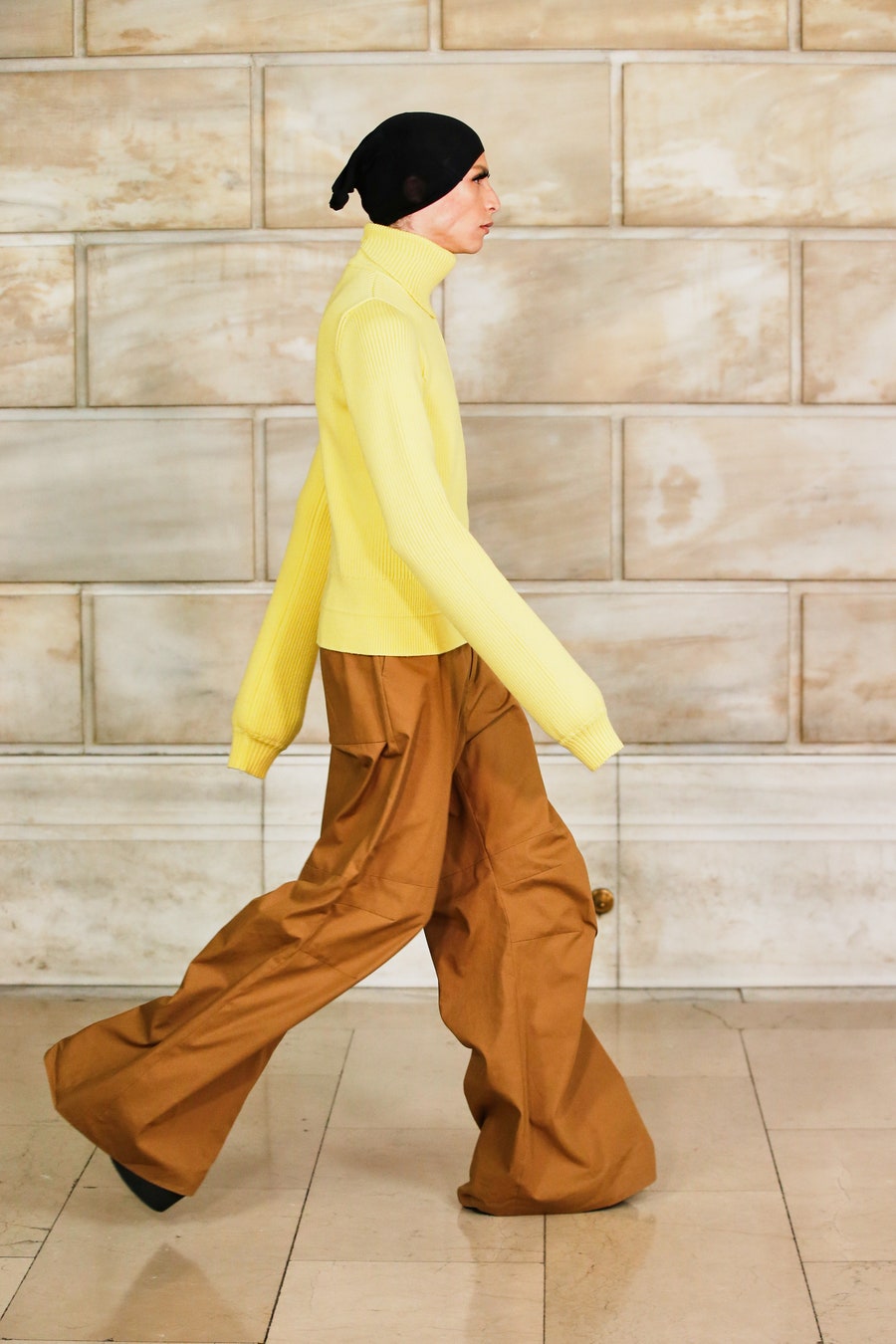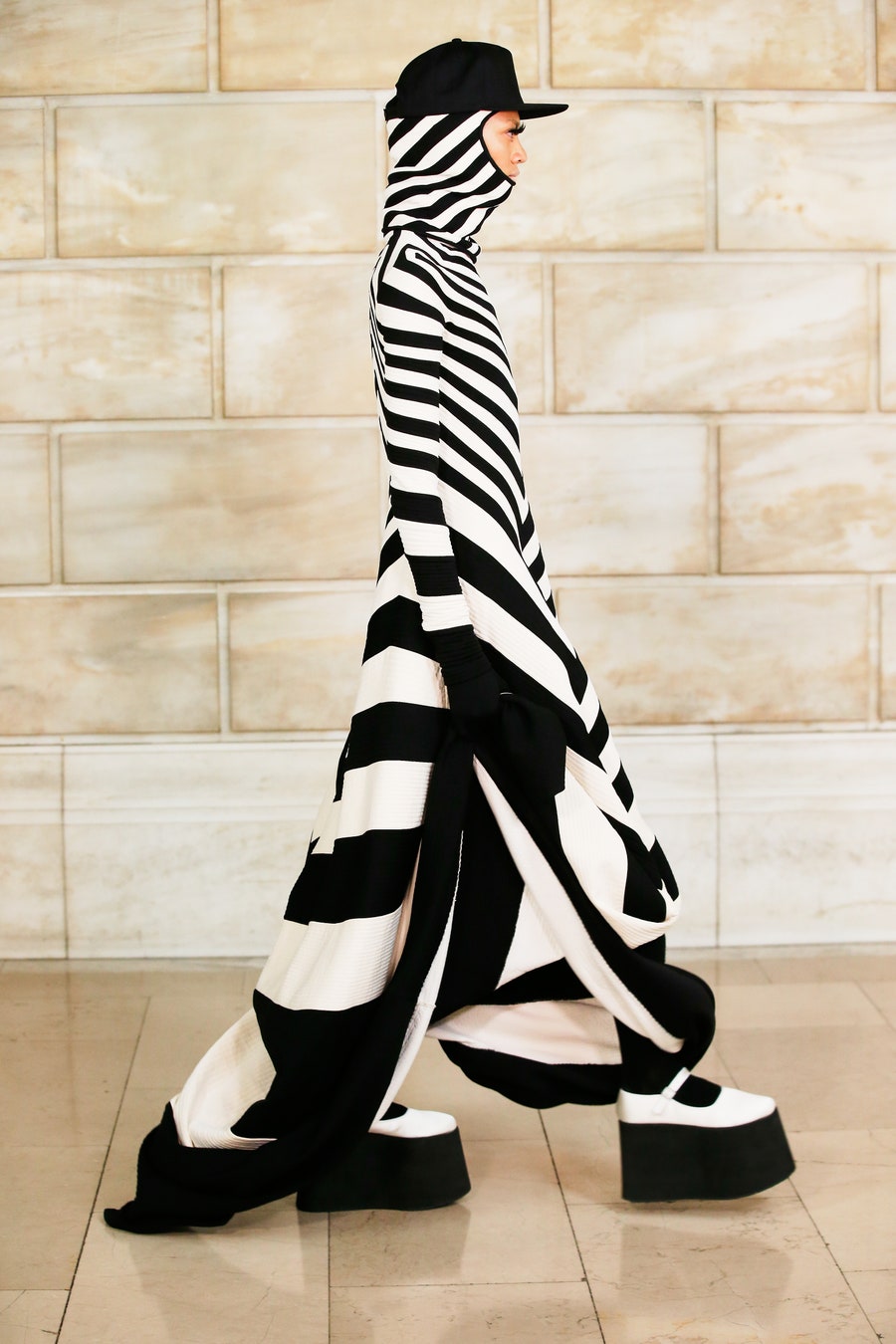 Платья на брюки; спортивные бомберы, декорироанные кольчугой на платья-кольчуги; дутые и классические пальто поверх; балаклавы, а на них кепки или bucket hats. А также: свитера, лыжные штаны, длинные перчатки и платья со шлейфами, юбки миди и боди с вырезами по бокам, дутые шарфы-снуды, леггинсы, самая крутая обувь сезона на платформе. И все это в миксе абсолютно сумасшедших текстур (лак, искусственный мех, дутые вещи), принтов и расцветок.