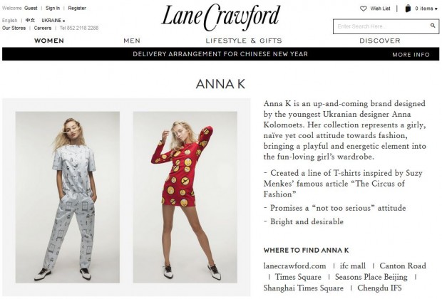 Сегодня стартовали продажи вещей из коллекций Anna K в крупнейшем азиатском ритейлере Lane Crawford (LC). Теперь одежду украинского бренда можно приобрести в 5 магазинах сети в Китае и Гонконге, а также на сайте Lane Crawford. В LC представлены вещи из коллекций Pre-Spring 2015 и S/S 2015, а также футболки из серий Fashion Circus и Fashion Dictionary.