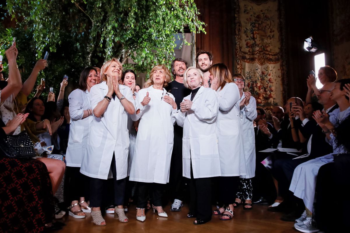 В завершение показа вместе с дизайнером на поклон вышли портные, конструкторы и технологи, которые работали над коллекцией.