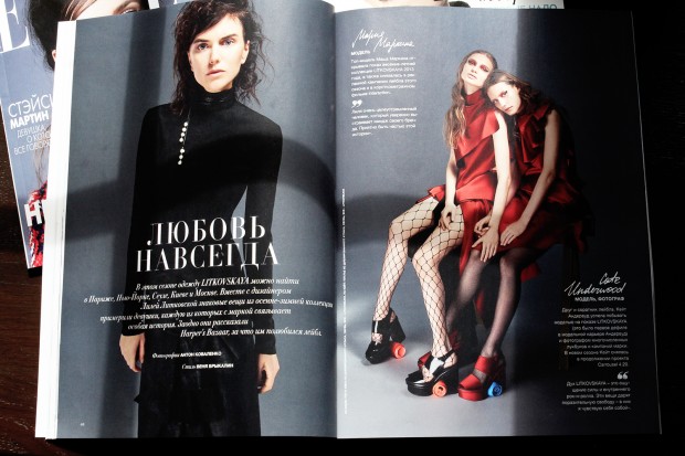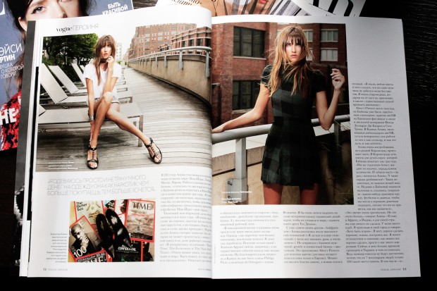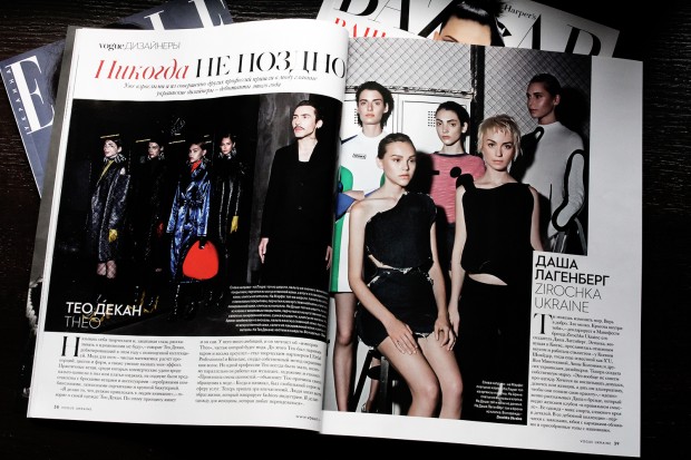 В Vogue намного больше материалов об украинцах, чем в других изданиях. Здесь есть истории стилистов Тео Декана и Даши Лагенберг, которые стали дизайнерами, спец. материал о Лилии Литковской, а также героиней номера стала украинская модель Алина Байкова, которая стала лицом Mercedes-Benz Kiev Fashion Days. Vogue — единственное издание, которое вышло с собственной обложкой, снятой фотографом Стивеном Пеном с моделью Гвиневер ван Синус.